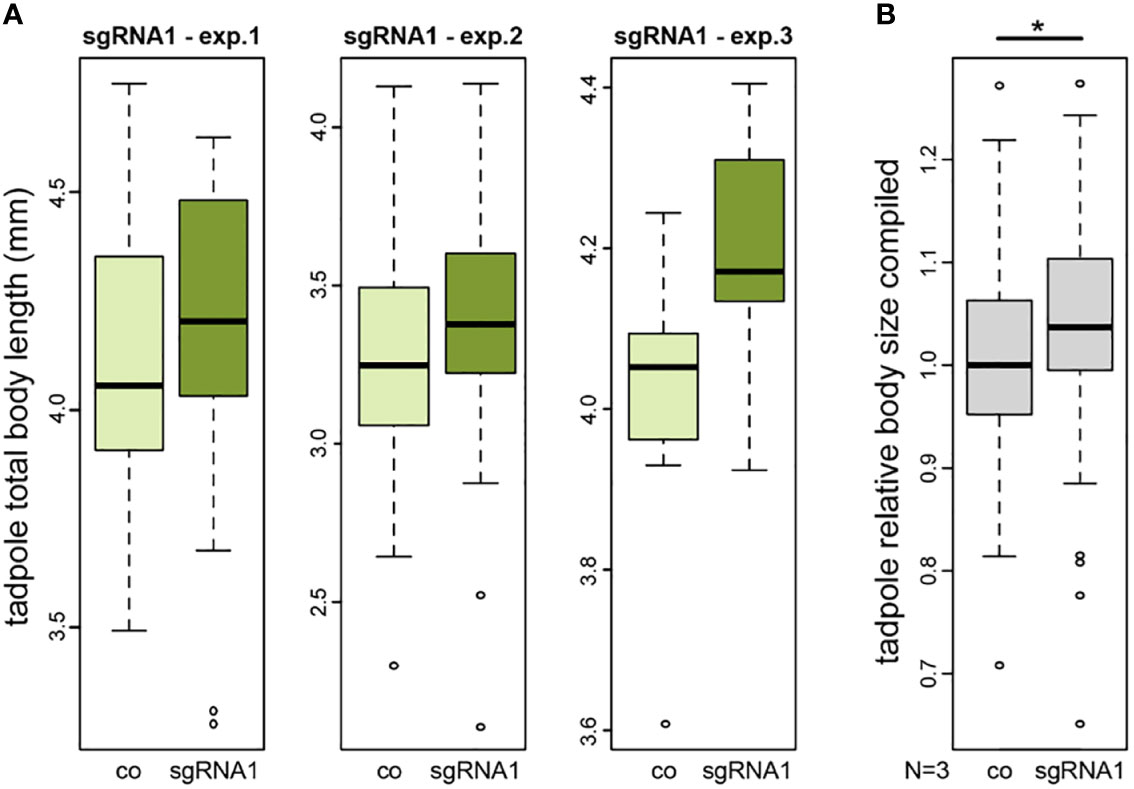 Figure 3 CRISPR/Cas-mediated knockout of nav2 causes enhanced embryonic growth. (A, B) Tadpole total body length measurements of three independent experiments. All experiments revealed a slightly increased average body size in nav2 sgRNA-injected specimens as compared to control littermates. (A) Three single experiments with sgRNA1 that specifically targets an exon orthologous to the exon harboring the human NAV2 missense mutation p.R2201C (exp.1, n=38 animals, stage 45; exp.2, n=102 animals, stage 44; exp.3, n=18 animals, stage 45); (B) Combined data of the three experiments in (A) after normalization to the mean of their controls revealed a significant increase of relative body sizes after sgRNA1 injections (p-value=0.023). Boxplot whiskers (error bars) are 1.5 * IQR +Q3 (upper), or 1.5 * IQR -Q1 (lower). co, control; exp., experiment; sgRNA, single-guide RNA; mm, millimeter.