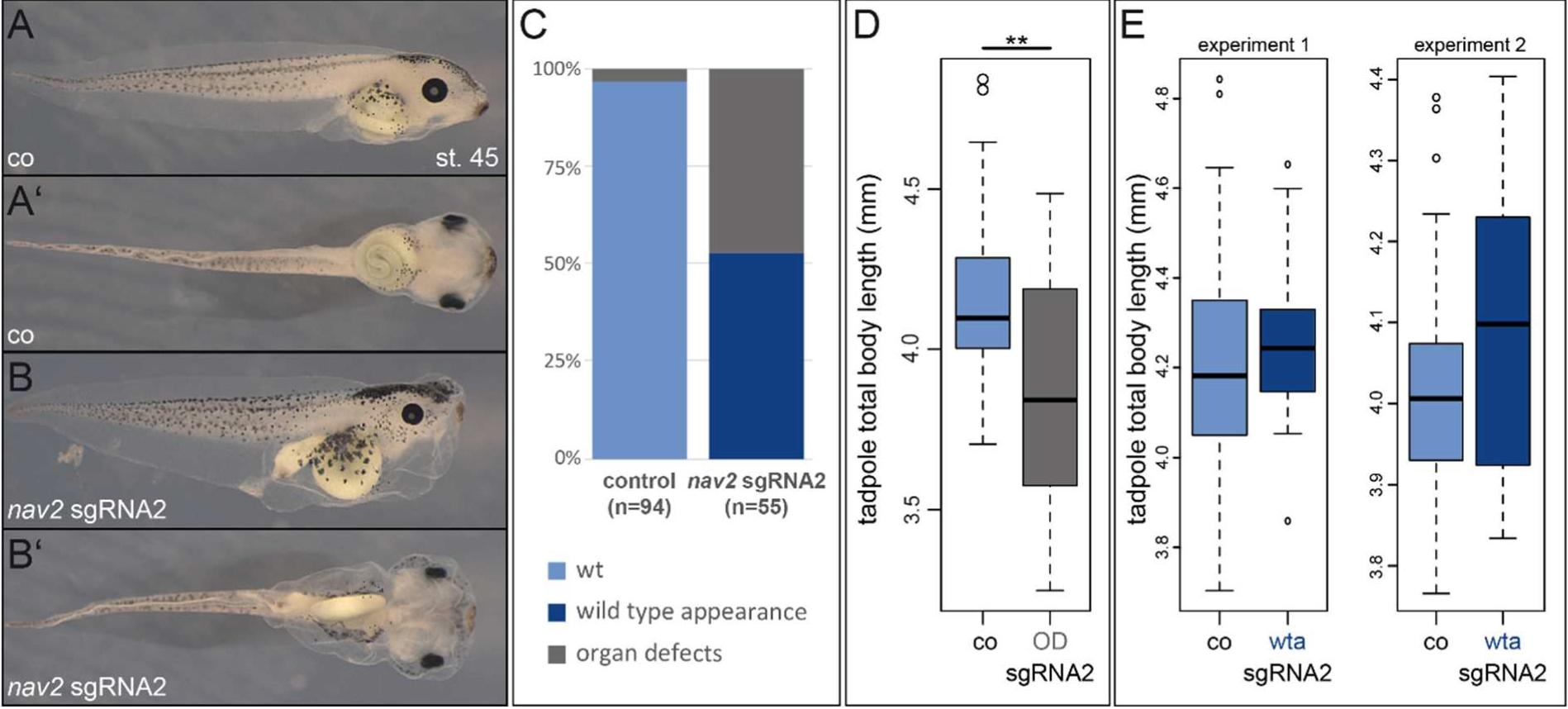 Supplementary Figure 2 | nav2 sgRNA2 causes wild type appearance in about half of the animals and organ defects and reduced embryonic growth in the other half. (AC) Overall appearance of representative stage 45 control specimen (A, A), or nav2 sgRNA2-injected specimen (B, B), illustrating organ malformations with edema formation in about 50% of nav2 sgRNA2 injections. Tadpoles are shown in lateral (A, B) and ventral view (A, B). (C, D) Quantification of total body length of tadpoles with organ defects (grey fraction in C), showing reduced body length when compared to control specimens (A, C). (E) Quantification of total body length of tadpoles without organ defects (dark blue fraction in C) of the two individual experiments with sgRNA2 (exp.1, n=53 animals, stage 45; exp.2, n=31 animals, stage 45) demonstrating a mild but not statistically significant increase in body size. co, control; sgRNA, single-guide RNA; mm, millimeter; OD, organ defects; st., stage; wta, wild type appearance.