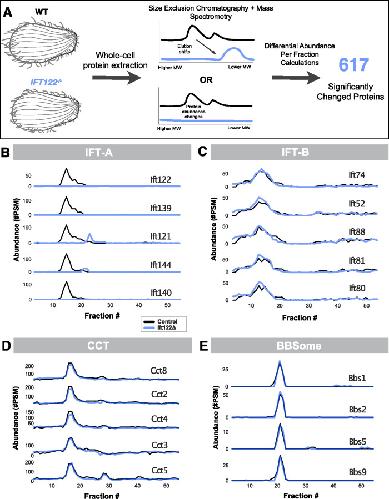 Label-free proteomic comparison reveals ciliary and nonciliary phenotypes of IFT-A mutants.
