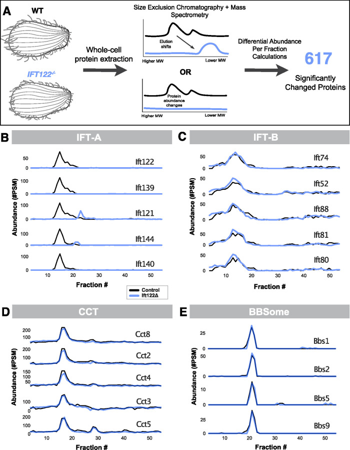 DIFFRAC is a powerful method for systematically comparing proteome content and organization between samples in a high-throughput manner. By subjecting control and experimental protein extracts to native chromatography and quantifying the contents of each fraction using mass spectrometry, it enables the quantitative detection of alterations to protein complexes and abundances. Here, we applied DIFFRAC to investigate the consequences of genetic loss of Ift122, a subunit of the intraflagellar transport-A (IFT-A) protein complex that plays a vital role in the formation and function of cilia and flagella, on the proteome of Tetrahymena thermophila. A single DIFFRAC experiment was sufficient to detect changes in protein behavior that mirrored known effects of IFT-A loss and revealed new biology. We uncovered several novel IFT-A-regulated proteins, which we validated through live imaging in Xenopus multiciliated cells, shedding new light on both the ciliary and non-ciliary functions of IFT-A. Our findings underscore the robustness of DIFFRAC for revealing proteomic changes in response to genetic or biochemical perturbation.
