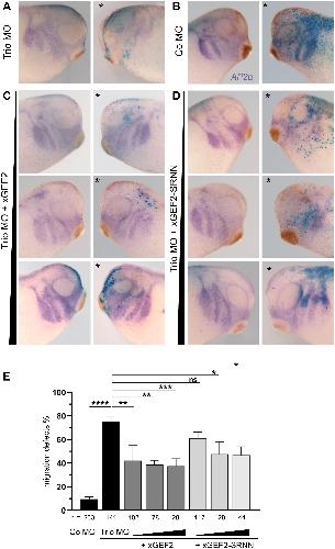 Fig. 3. Microtubule plus-end localization of Trio is required for NC migration. (A-D) Embryos were injected with 4 ng Trio MO or a control MO together with 50, 75, 100 pg wild-type xGEF2 or xGEF2-SRNN RNA in combination with 75 pg lacZ RNA as lineage tracer in one dorsal animal blastomere at the eight-cell stage. NC cell migration was analyzed at stage 26 by AP2-α in situ hybridization. (A,B) Trio morphant embryos showed defects in NC migration compared to control embryos. (C) Co-injection of wild-type xGEF2 rescued the Trio loss-of-function NC migration defects at all used concentrations. (D) In contrast, the xGEF2-SRNN-mutant failed to restore NC migration at low concentrations. The injected side is marked with an asterisk. Scale bar = 500 μm. (E) Graph summarizing the percentage of embryos with NC cell migration defects in at least three independent experiments. +s.e.m. and the number of analyzed embryos (n) are indicated for each condition. **** p < 0.0001, ***p < 0.001, **p < 0.01, *p < 0.05, ns = not significant (one-way ANOVA). |