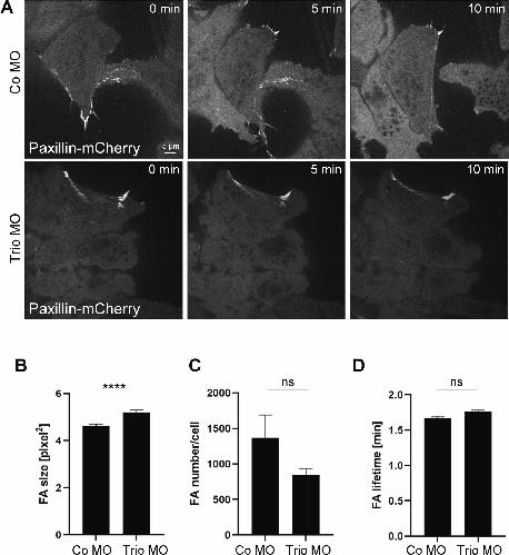 Fig. 5. Loss of Trio function affects focal adhesion dynamics. (A) Embryos were injected with 6.5 ng Trio MO or a control MO together with 400 pg Paxillin-mCherry RNA and 250 pg mGFP RNA in one blastomere at the two-cell stage. NC cells were explanted at stage 18 and cultured on fibronectin-coated microscopy slides (9 Co MO and 11 Trio MO explants from three independent experiments were analyzed). NC cells were recorded each minute for a total of 40 min. Images after 0, 5 and 10 min are shown. Focal adhesions in control cells are highly dynamic, while focal adhesions in Trio loss-of-function NC cells remain mostly at their position. (B) Graph showing focal adhesion size, s.e.m. are shown ****p < 0.001 (Mann-Whitney test). (C) Graph showing focal adhesion number, s.e.m. are shown; ns = not significant (unpaired Student's t-test). (D) Graph showing focal adhesion lifetime, s.e.m. are shown; ns = not significant (Mann-Whitney test). |