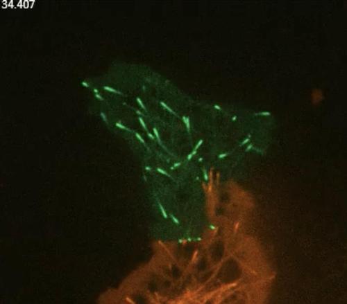 Movie 6. Microtubule plus-end dynamics at the leading edge of Co MO explants visualized by EB3-mCherry expression, plasma membrane is marked by GFP. |