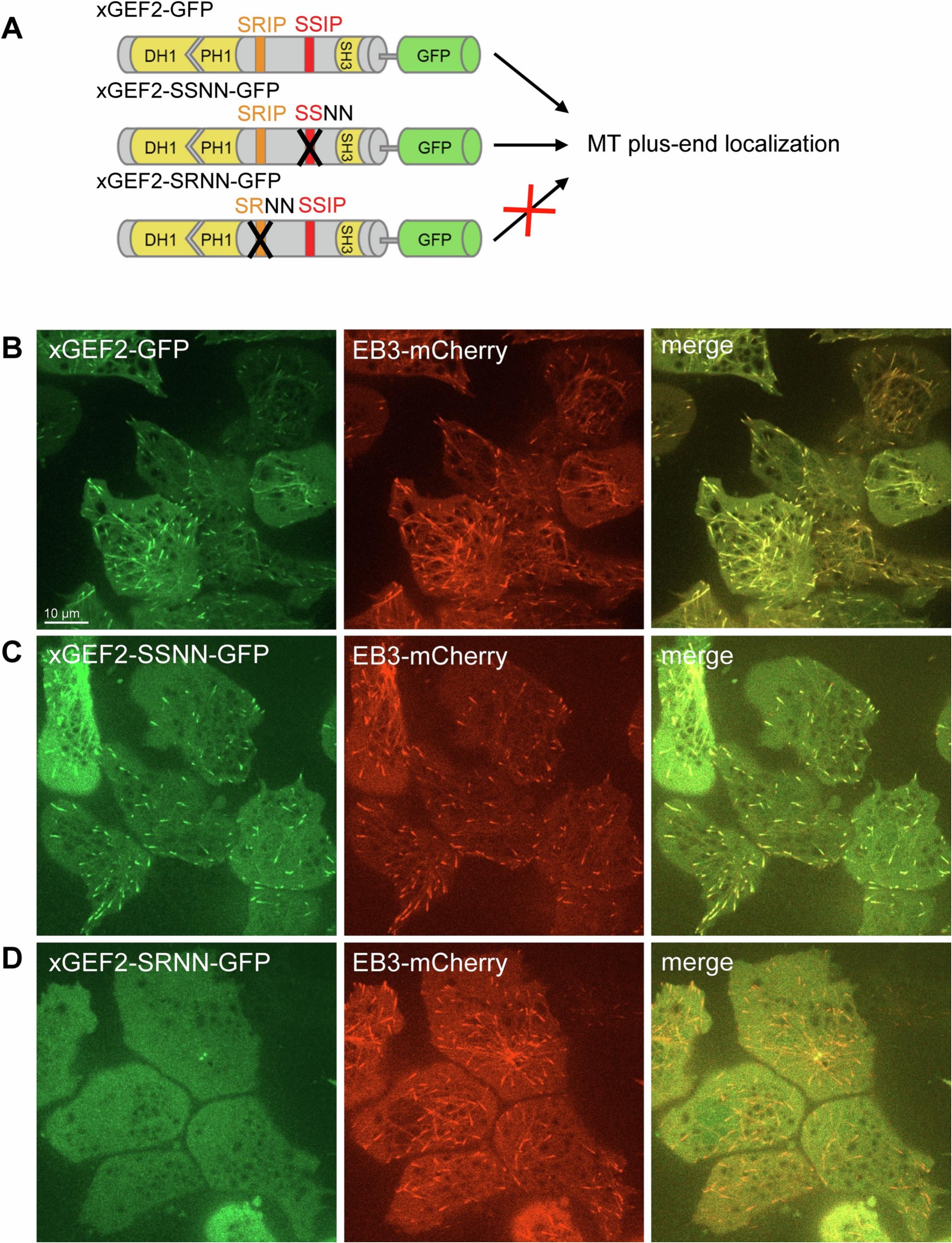 Fig. 2. The XGEF2-SRNN mutant abolished co-localization of the GEF2 domain to microtubule tips. (A) Schematic structure of xGEF2 constructs. The xGEF2-GFP construct consists of the PH1, DH1 and SH3 domains and two SxIP motifs (SRIP and SSIP) that may act as microtubule plus-end localization signals. (B-D) Mutation of the N-terminal SRIP motif into SRNN completely abolished microtubule plus-end binding, while mutation of the C-terminal SSIP motif into SSNN did not. Embryos were injected in one blastomere at the two-cell stage with 200 pg xGEF2-GFP RNA, xGEF2-SSNN-GFP RNA or xGEF2-SRNN-GFP RNA in combination with 300 pg EB3-mCherry RNA. NC cells were explanted at stage 18 and protein localization was analyzed at migratory stages. Experiments were performed in triplicate and 63 xGEF2-SRNN-GFP and 50 xGEF2-SSNN-GFP cells were analyzed, which all showed the presented phenotype. |
