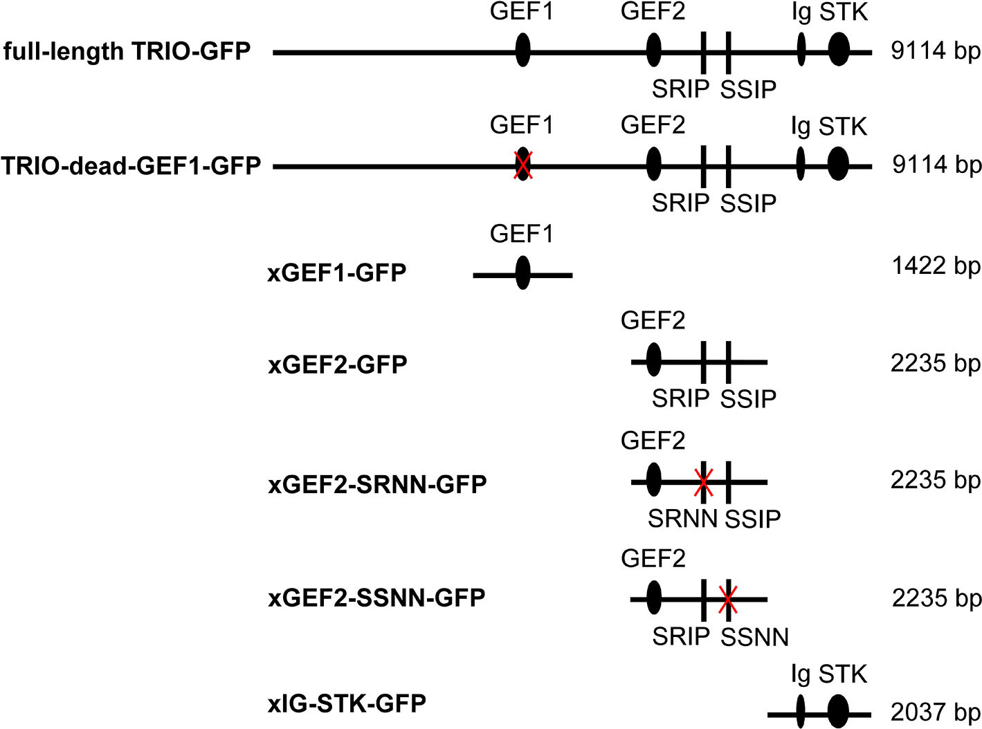 Fig. S1. Schematic representation of GFP-tagged Trio constructs. The full-length TRIO-GFP construct contains all the catalytic Trio domains. The Trio-dead-GEF1-GFP construct carries a point mutation in the GEF1 domain that eliminates its exchange activity (red X indicates the catalytically dead GEF1 domain). The xGEF1-GFP construct consists of the Xenopus N-terminal Trio DH1, PH1 and SH3 domains. The xGEF2-GFP construct consists of the Xenopus C-terminal Trio DH2, PH2 and SH3 domains, including both SxIP motifs. The xGEF2-SRNN-GFP construct carries a point mutation in the first SxIP motif (from SRIP to SRNN), which abolishes MT plus-end binding. The xGEF2-SSNN-GFP construct has a point mutation in the second SxIP motif (from SSIP to SSNN), but still co-localizes with MT plus-ends. The xIG-STK-GFP construct consists of the Xenopus N-terminal Trio Ig and STK domains. The size of all constructs is given in base pairs. |