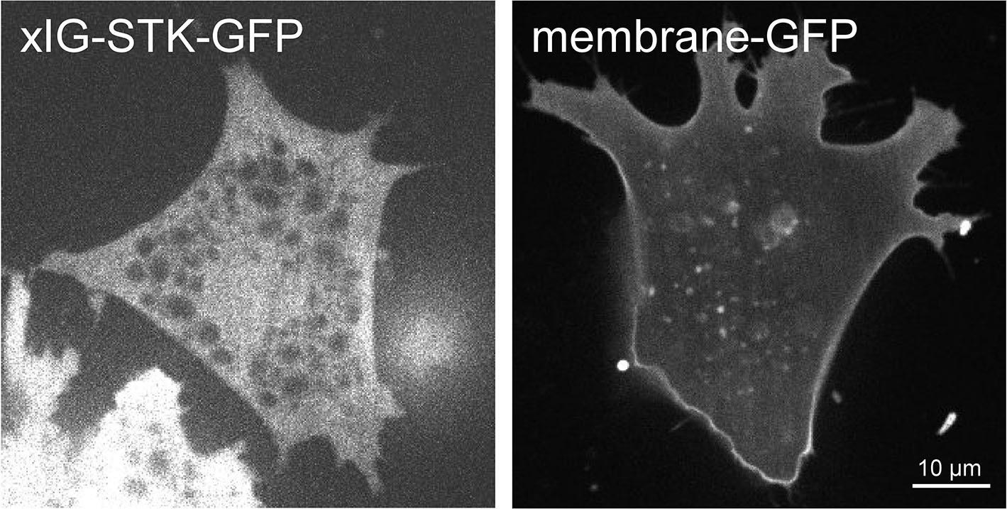Fig. S2. A Trio construct consisting of the IgG domain and the serine/threonine kinase domain (xTrio-IG-STK) does not co-localize with microtubules. Embryos were injected in one blastomere at the two-cell stage with 200 pg xTrio-IG-STK RNA or 150 pg mGFP RNA, NC cells were explanted at stage 18 and protein localization in migrating cells was analyzed using spinning disk microscopy. Experiments were performed in triplicate. |