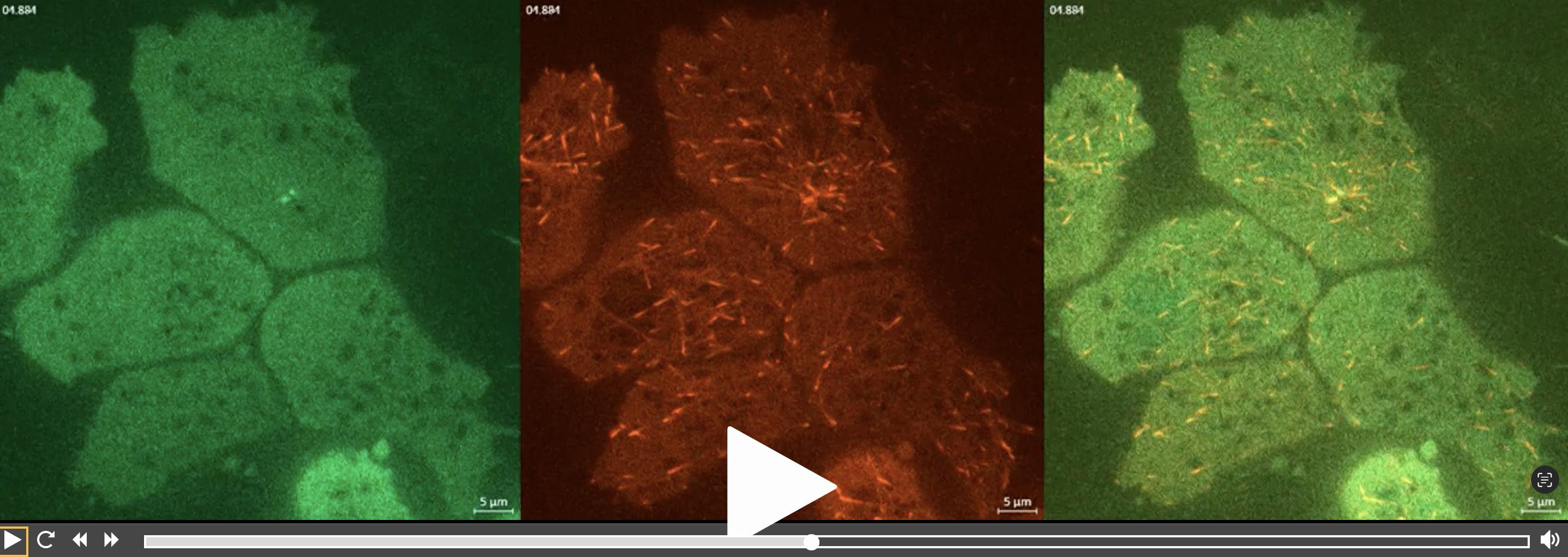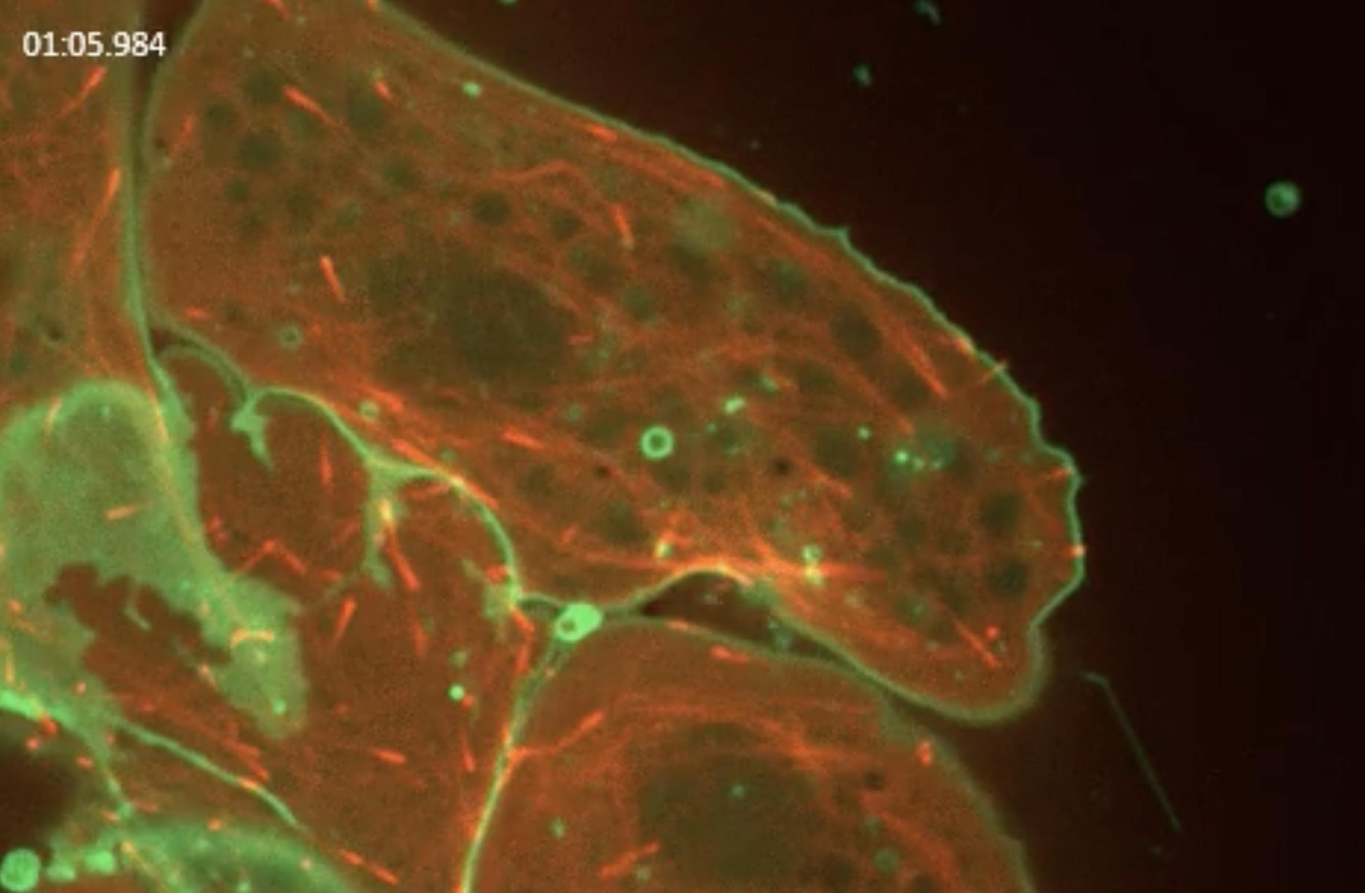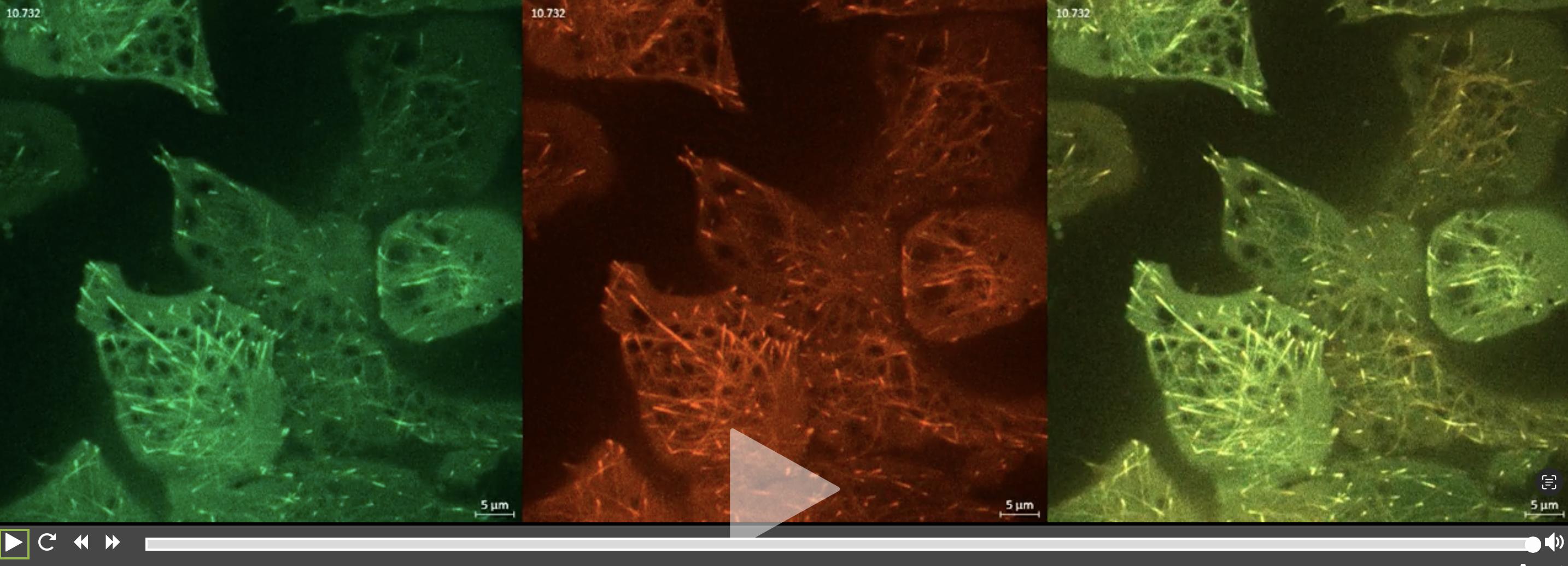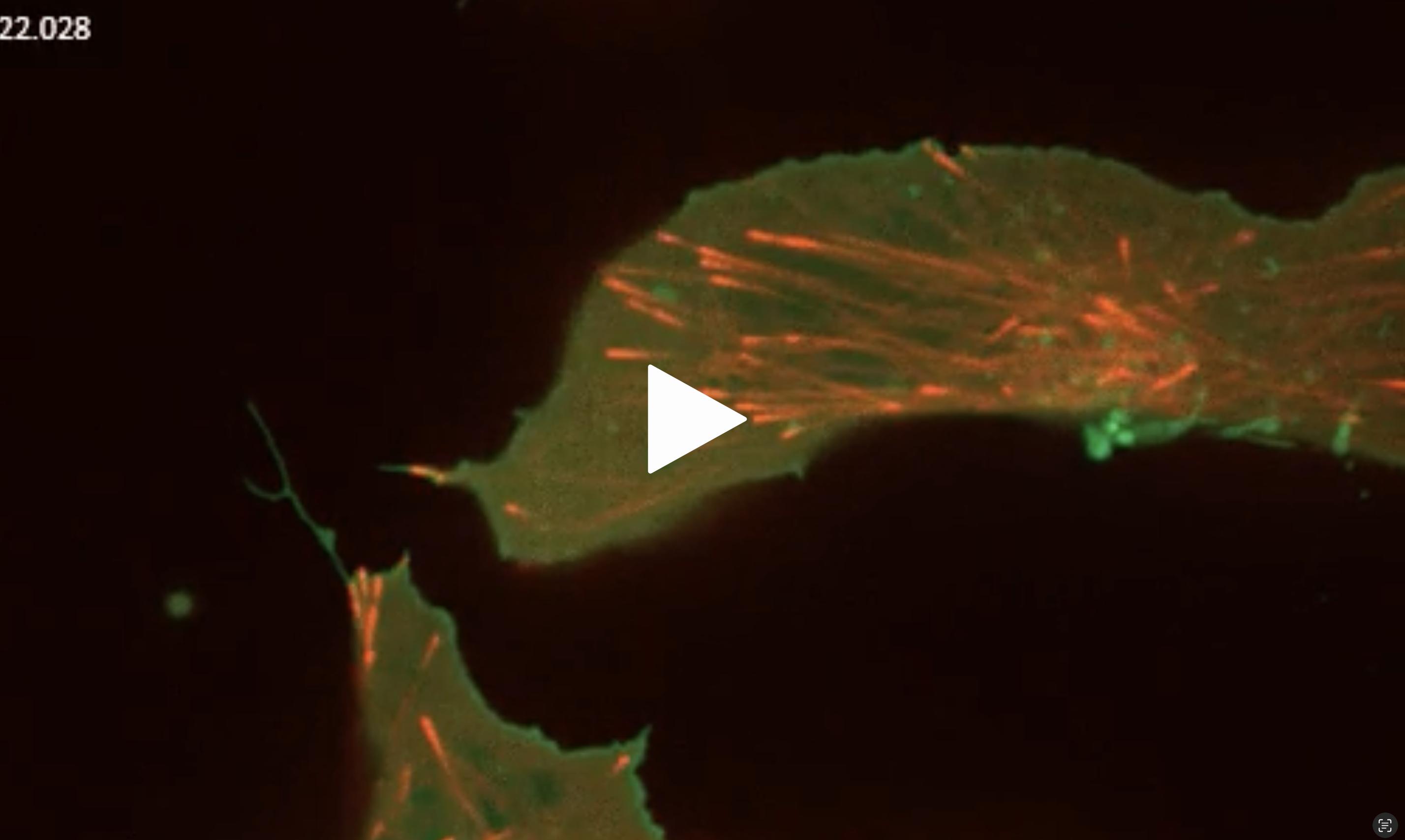 Still from Movie 2. xGEF2-GFP (green) co-localizes with EB3-mCherry in Xenopus NC cells. |