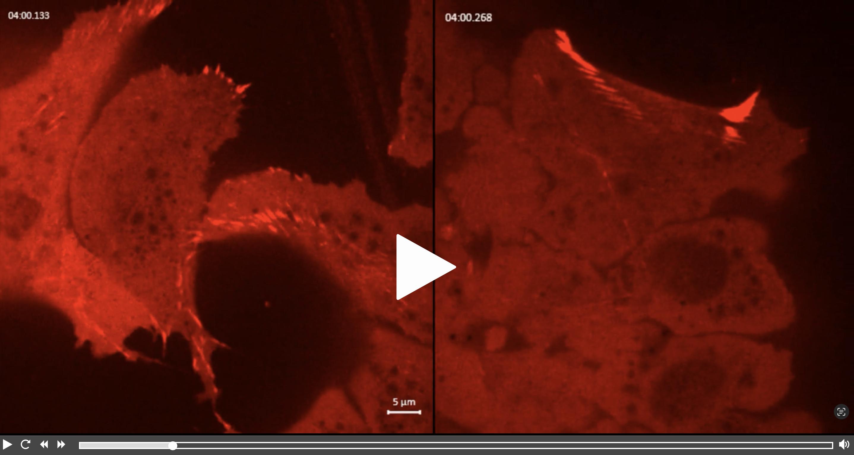 still from Movie 5. Focal adhesion dynamics in Trio morphant (right) and control (left) NC cells expressing Paxillin-mCherry (red). |