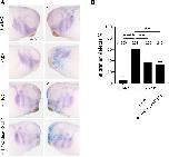 Fig. S4. Mutational inactivation of the GEF1 domain does not impair its ability to rescue the Trio morphant NC migration defects. Embryos were injected with 4 ng Trio MO alone or in combination with 30 pg full-length TRIO-GFP DNA or 30 pg TRIO-dead-GEF1-GFP DNA in one dorsal animal blastomere at the eight-cell stage. Co-injection of 100 pg lacZ RNA was used as lineage tracer and NC cell migration was analyzed by AP2-α in situ hybridization. A As shown before, Trio MO injection caused severe NC migration defects while co-injection of TRIO DNA and TRIO-dead-GEF1 DNA significantly restored in vivo NC migration. B Graph summarizing the percentage of embryos with NC cell migration defects of four independent experiments, +s.e.m. and number of injected embryos are shown. **** p < 0.0001, **p < 0.01, *p < 0.05 (one-way ANOVA). |