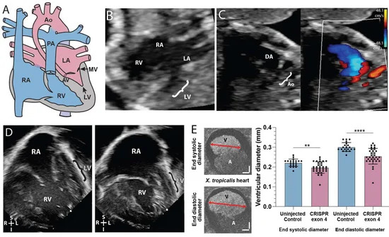 Figure 1. SMC5 variant associated with impaired cardiac development in proband and frog knockdown model. (A) Graphic of hypoplastic left heart syndrome showing the small left ventricle (LV), small stenotic mitral valve (MV), aortic valve (AV), and hypoplastic aorta (Ao). (B) Fetal echocardiogram at 19 weeks gestation in an apical 4-chamber view demonstrates reduced left ventricular (LV) size compared to the right ventricle (RV) as well as the larger right atrium (RA) and small left atrium (LA). (C) A fetal echocardiogram at 23 weeks gestation in a view of the aortic arch demonstrates a small aortic arch (Ao) and larger ductus arteriosus (DA) with color Doppler imaging showing minimal blood flow (red) through the hypoplastic aortic arch and a much larger volume of blood flow (blue) across ductus arteriosus. Color scales estimate fluid velocity, with each color representing fluid flow toward (red) or away (blue) from the ultrasound probe located at the top of the image. (D) Postnatal echocardiogram at 28 days old in an apical 4-chamber view demonstrates a large right atrium (RA) and right ventricle (RV) with a thin hypoplastic left ventricle (LV). (E) Cross section of tadpole atria (A) and ventricle (V) of stage 45 live X. tropicalis embryos (n = 50). Scale bars indicating 50 m. ** p < 0.01, **** p < 0.0001 by t-test in (E). |