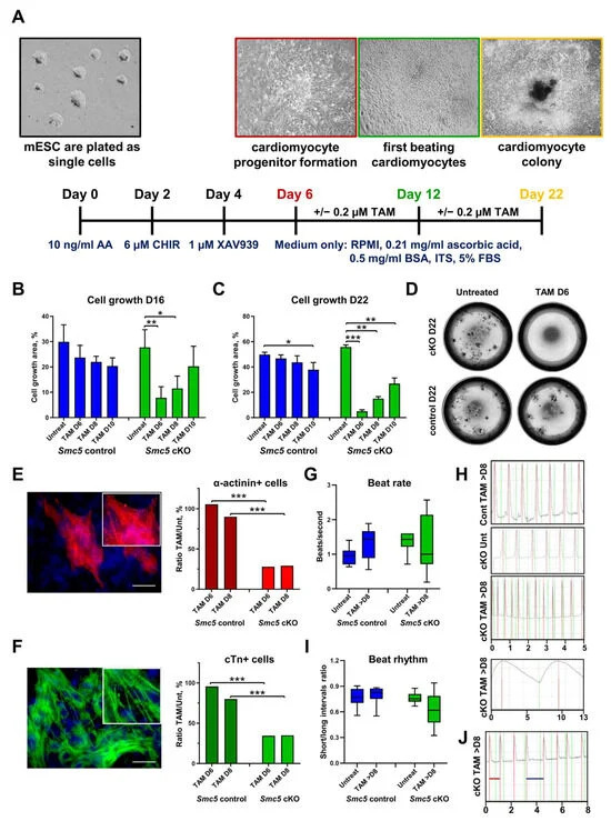 Figure 2. Smc5 is required for mouse cardiac development and function. (A) The outline of mESC cardiac differentiation and tamoxifen treatment. (BD) Smc5 cKO in cardiac progenitors causes a significant reduction in cell proliferation. Tamoxifen (TAM) was added on day 6, day 8, and day 10 of mESC differentiation. The cell outgrowth was evaluated on day 16 (B) and day 22 (C,D). Images of live cell cultures are shown for differentiation day 22 (D). Data are a cumulative of two independent experiments performed in replicas. Data was assessed using the MannWhitney t-test and significant comparisons are given as * p < 0.05, ** p < 0.01, and *** p < 0.001, and other comparisons were deemed non-significant. (E,F). Smc5 cKO in cardiac progenitors causes a significant reduction in resulting cardiomyocytes based on the evaluation of sarcomere proteins -actinin (red) and cardiac troponin T (cTn) (green) expression. Tamoxifen (TAM) was added on day 6 and day 8 of mESC differentiation. Cells were evaluated on day 18. The ratio of tamoxifen-treated to untreated cells is shown (n 5 103 total cells). Examples of -actinin (red) (E) and cardiac troponin T (cTn) (green) (F) expression in mESC-derived cardiomyocytes are shown. Scale bar 25 m. Data was assessed using the MannWhitney t-test and significant comparisons were given as *** p < 0.001, and other comparisons were deemed non-significant. (G) Smc5 cKO in cardiac progenitors results in higher variability in beat rate (n = 616). (H) Examples of TAM-treated control (Cont) (Supplementary Movie S1), untreated (Unt) cKO (Supplementary Movie S2), and TAM-treated cKO cardiomyocytes with fast and slow beat rate are shown (Supplementary Movies S3S5) (scale, seconds). (I) Smc5 cKO in cardiac progenitors results in higher variability in beat rhythm (n = 712). (J) An example of TAM-treated cKO cardiomyocytes with short (red line) and long (blue line) intervals between contractions is shown (Supplementary Movie S6) (scale, seconds). |