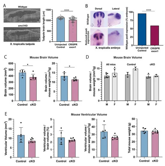 Figure 3. smc5 knockout alters brain development in frogs and mice (A) Sagittal cross-section of stage 45 X. tropicalis brain in control and smc5 KO (CRISPR exon 1) embryos. Scale bars presenting 100 m. (B) Whole-mount in situ hybridization of pax6 in stage 28 X. tropicalis embryos, highlighting reduced expression in the smc5 KO (CRISPR exon1) brain, notochord, and developing eye. Images show pax6 distribution rather than scale. (C) Brain volume and brain volume normalized by weight in control and Smc5 cKO mice measured by MRI. (D) Brain volume normalized by weight compared between male (M) and female (F) mice, showing all, control, or Smc5 cKO mice. (E) Brain ventricular volume of control or Smc5 cKO mice is shown as raw volume, ventricular volume normalized by brain volume, or ventricular volume normalized by weight. Legend: left (L), right (R), dorsal (D), ventral (V), anterior (A) and posterior (P), * p < 0.05, **** p < 0.0001 by t-test in (A,CE) and by chi-square analysis in (B). |