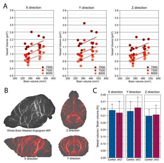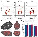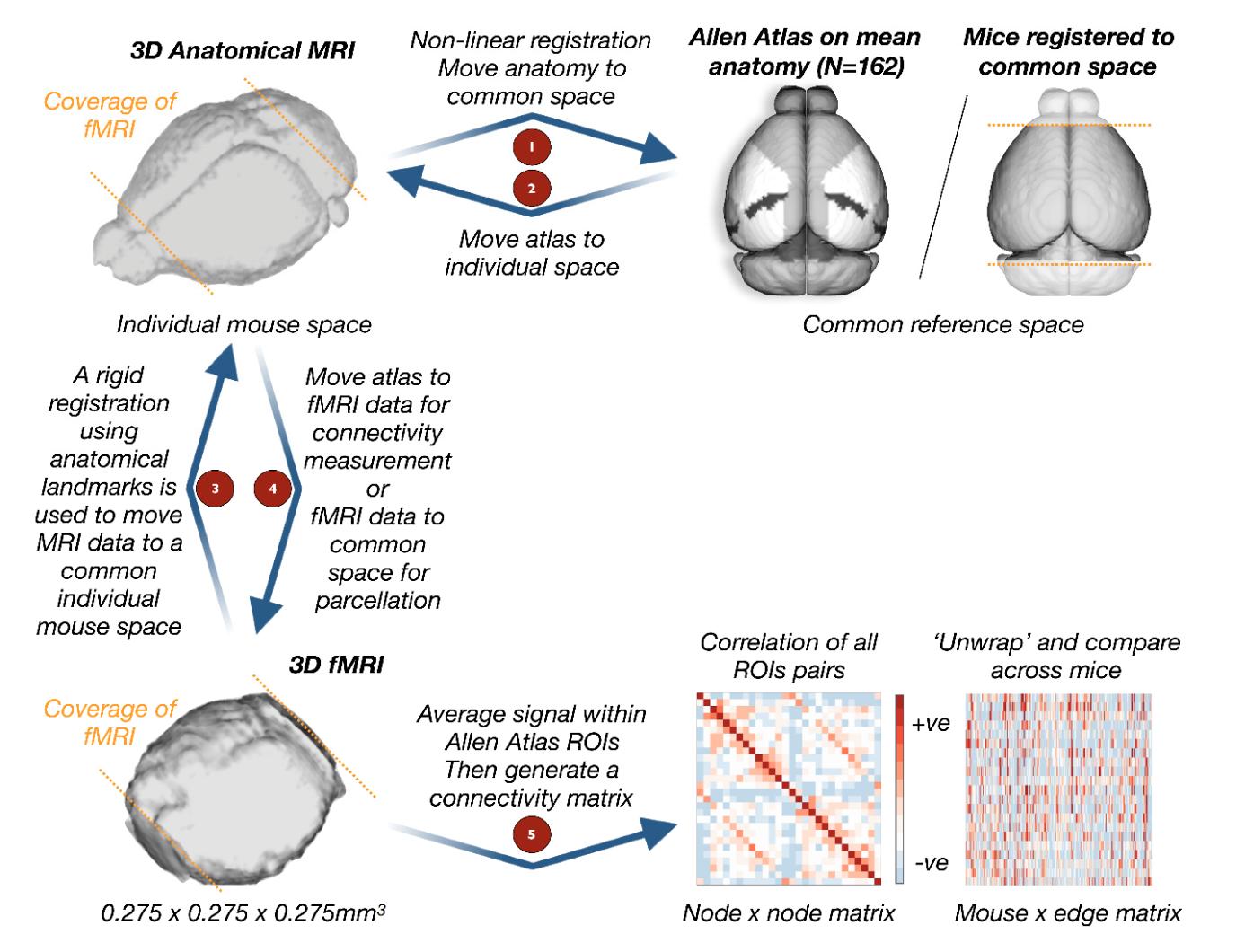 Supplementary Figure S3. Vessel volume was correlated with total brain volume Anatomical data from individual mice are registered to a common space. We use a reference space created from the nonlinear registration, and subsequent averaging, of n=162 mice. This reference space has been registered to an MRI compatible version of the Allen Atlas. This allows us to estimate the volume of different regions of interest (ROI) from the Allen Atlas for each mouse and to impose the Allen Atlas onto the fMRI data for functional connectivity measurements. |
