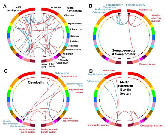 Figure 6. Smc5 cKO disrupts somatomotor/somatosensory, cerebellar, and medial forebrain functional connectivity. Connectivity maps use each color in a semicircle to represent a different brain region, with the left and right semicircle representing each respective mouse brain hemisphere. While connections exist between all regions, lines shown between regions of interest (ROI, black arrow) denote a change in connectivity that distinguishes between control and Smc5 cKO mice. Red lines represent an increase in synchrony between ROIs (red text) and blue lines represent a decrease in synchrony between ROIs (blue text). (A) Combined connectivity changes across the brain, with all ROIs shown. (B–D) Connectivity patterns associated with each interrogated ROI (named by black text) are individually shown. (B) Somatosensory and somatomotor connectivity maps, with somatomotor ROI represented by innermost black arrows, and somatosensory ROI represented by outermost black arrows. (C) Cerebellar connectivity map and (D) Medial forebrain bundle system connectivity map. n = 12 for all experiments. |