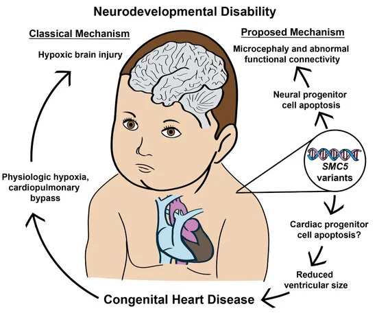 Figure 7. SMC5 malfunction during embryonic development produces CHD and NDD through independent processes. The data presented indicates that neurodevelopmental defects can occur with and without concurrent CHD. Furthermore, SMC5 mutations can alter brain FC and cause developmental delays. |