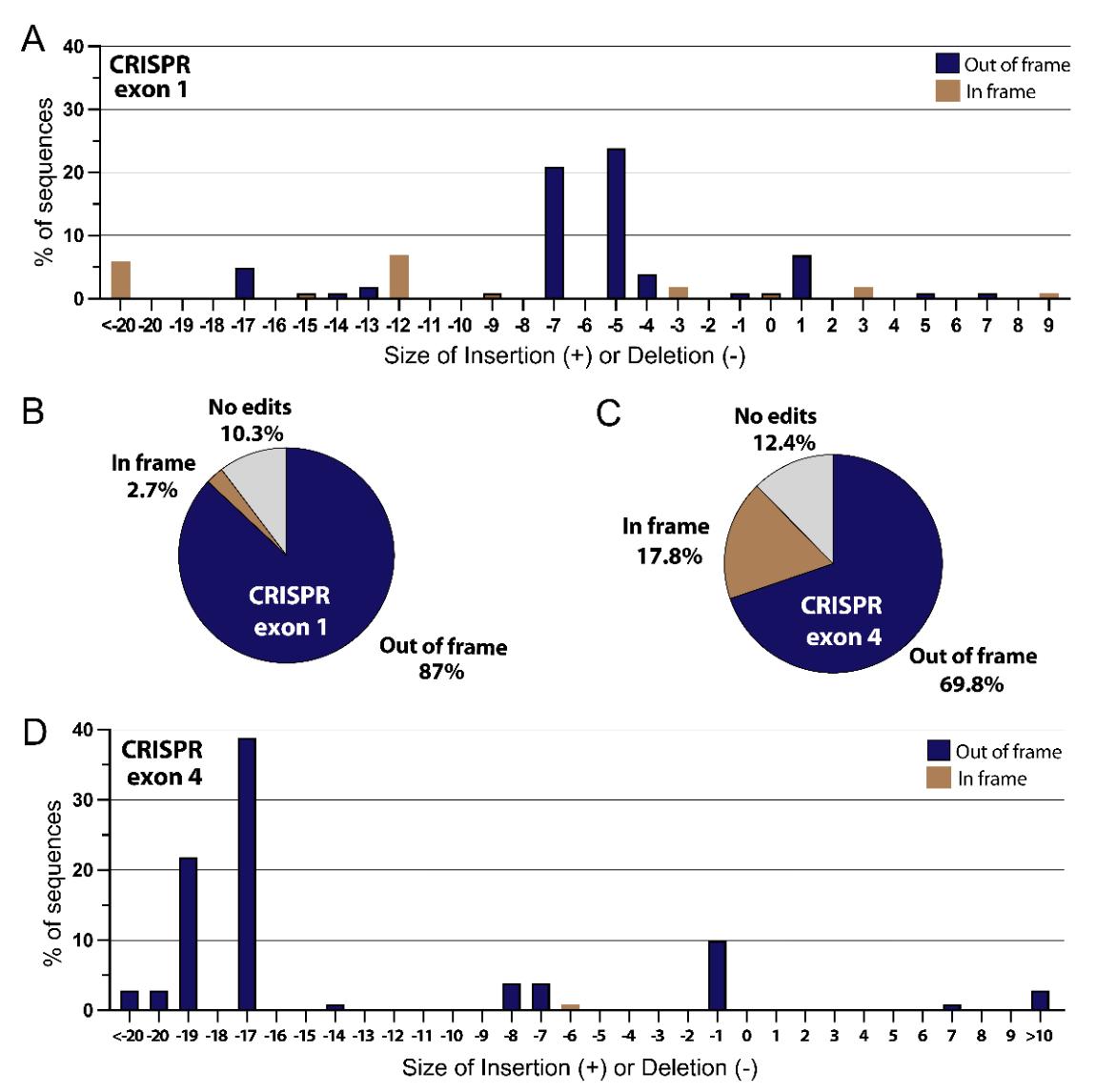 Supplementary Figure S2. CRISPR-Cas9 complexes targeting smc5 cause insertion/deletions in X. tropicalis genome (A-D) Bar graphs show frequency and size of insertion or deletion (indel) in smc5 induced by CRISPR-Cas9 activity. Pie graphs show type and frequency of indel caused by CRISPR-Cas9. Indel size in multiples of 3 correspond to in frame indels (brown), and samples without indels considered to have no edits. Indels of all other sizes considered out of frame edits (blue). DNA samples without edits not represented on bar graph. (A) CRISPR-exon 1 indel size and frequency, (B) CRISPR-exon 1 edit type and frequency, (C) CRISPR-exon 4 edit type and frequency, (D) CRISPR-exon 4 indel size and frequency. n=5 for all experiments. |