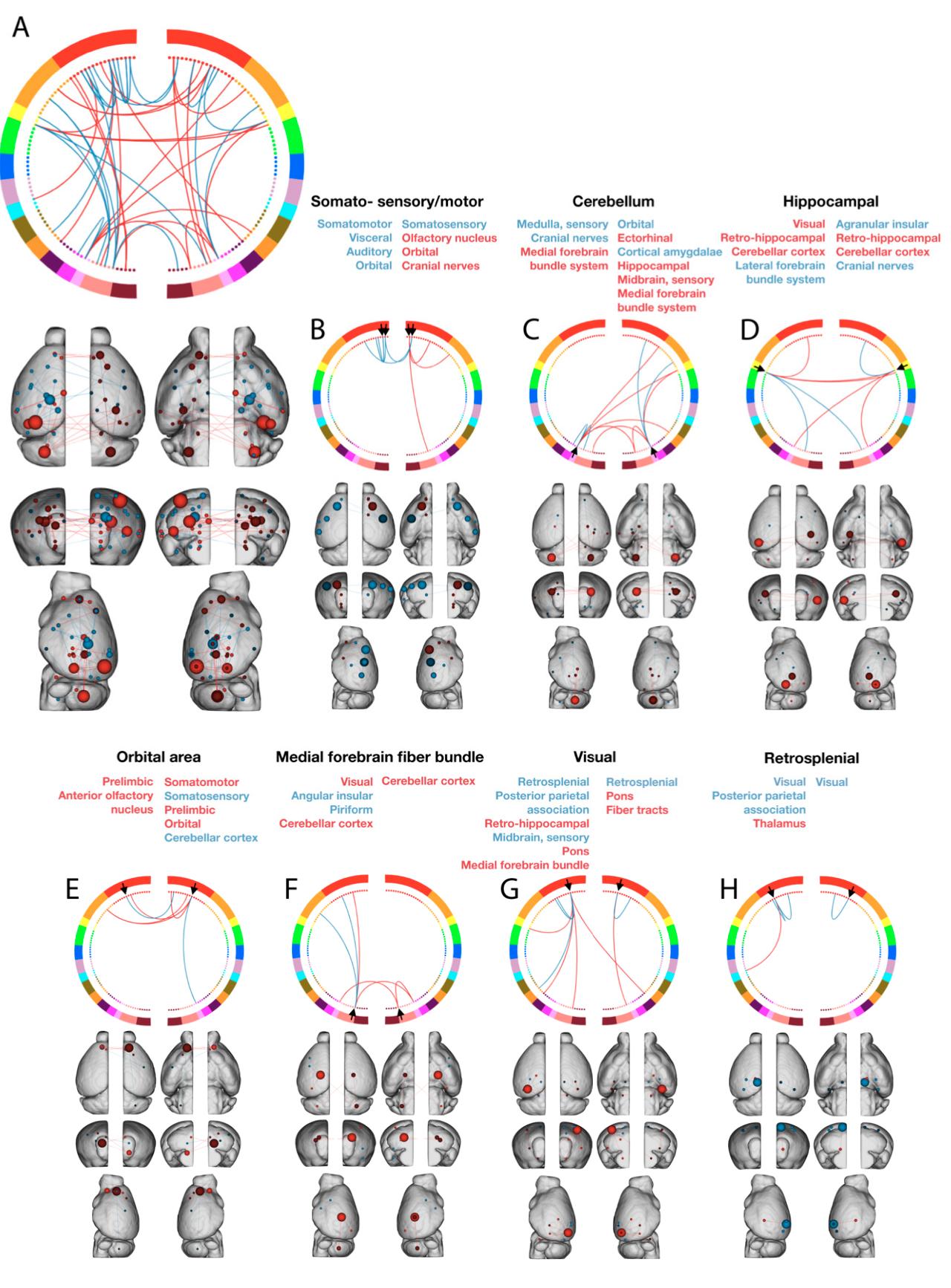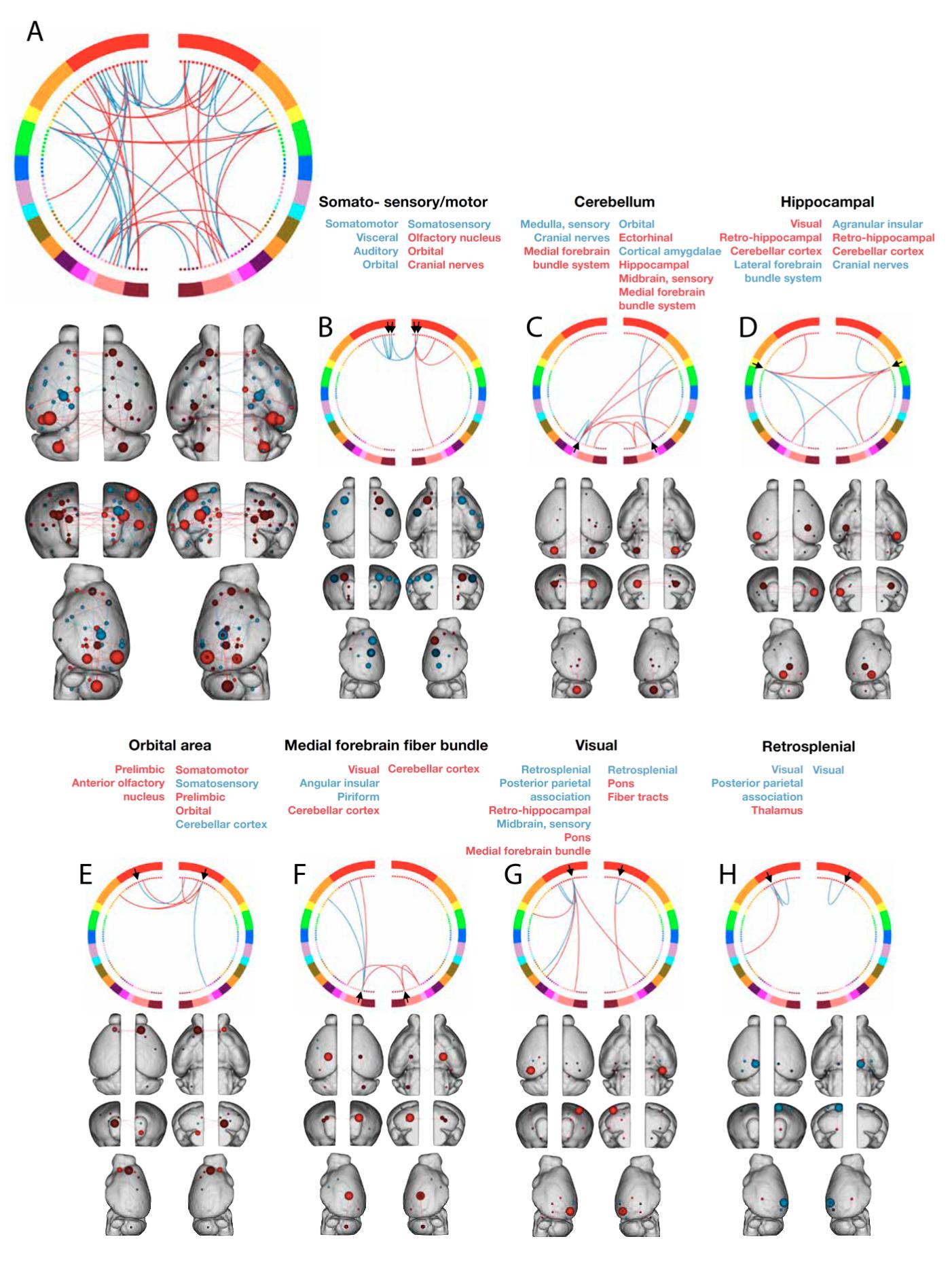 Supplementary Figure S5. Smc5 cKO disrupts functional connectivity in all brain regions interrogated. Connectivity maps and corresponding mouse brain representations with respective regions of interest (ROIs) described by black text atop of each section. Lines shown between the ROI and another region represent a significant change in connectivity compared to control mice. Red lines represent increased synchrony and blue lines represent decreased synchrony. List of brain regions above connectivity map summarize regions that show significant differences in connectivity. Volumetric representation of mouse brain from each visual angle, with topmost images showing dorsal (left) and ventral (right) aspects, middle images showing rostral (left) and caudal (right) aspects, and bottom set of images showing left lateral (left) and right lateral (right) aspects of the mouse brain. (A) Combined connectivity changes across the brain, with all ROIs shown. Additional connectivity maps with ROIs in somatosensory and somatomotor regions (B), cerebellum (C), Hippocampus (D), Orbital area (E), Medial forebrain bundle (F), Visual cortex (G), and Retrosplenial region (H). n=12 for all experiments. |