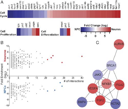 Bioinformatic analysis of differentially expressed transcripts identifies functional categories and interaction networks. (A) Fold change of transcript expression between NPCs and immature neurons in GO biological processes: cell proliferation, cell differentiation, and cell cycle. (B) Protein interaction network analysis of DE transcripts, arranged by number of binding partners (interactions) in NCPs (blue) and neurons (red). (C) Network analysis of the nine transcripts highlighted in (B) with the most binding partners, blue indicates genes up-regulated in neural progenitor cells and red indicates increased expression in immature neurons. Fold change scale applies to (A) and (C).
