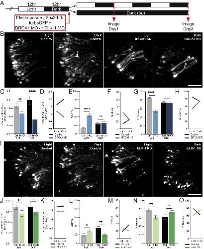 BRCA1 and ELK-1 mediate visual experience–dependent effects on neural progenitor cell fate. (A) Diagram of treatment and imaging protocol. (B–H) BRCA1 mediates the effects of visual stimulation on NPC fate. (B) Representative images of tGFP+ cells collected on day 3 from animals exposed to 12 h light/12 h dark (light) or continuous dark (dark) with BRCA1 KD or control morpholinos. (Scale bar: 50 µm.) (C–H) Quantitative analysis of imaging data. (C) BRCA1 KD (B-KD) blocked the normal increase in GFP+ cells over the 3-d imaging period in animals exposed to 12 h light/12 h dark (light: gray bar vs. light blue bar) or dark (dark: black bar vs. dark blue bar) compared to control morpholino-treated animals. n = 17 to 24 animals per condition/timepoint. (D) Profile plot of data in (C) demonstrating that the effect of visual experience on tGFP+ cell number depends on BRCA1. (E and G) BRCA KD significantly increased NPCs in animals exposed to light [(E) light: gray bar vs. light blue bar] and decreased neurons [(G) light: gray bar vs. light blue bar] compared to control morpholino-treated animals. BRCA1 KD did not affect NPCs (E) or neurons (G) in animals exposed to dark (black vs. dark blue bars). (F and H) Profile plots of data in (E) and (G) demonstrating that the effect of visual experience on NPC fate depends on BRCA1 expression. (I–O) ELK-1 mediates the effects of visual stimulation on NPC fate. (I) Representative images of tGFP+ cells collected on day 3 in animals exposed to light or dark with ELK-1 KD or control morpholinos. (Scale bar: 50 µm.) (J–O) Quantitative analysis of in vivo imaging data. (J) ELK-1 KD (E-KD) blocked the normal increase in GFP+ cells in animals exposed to light (light: gray vs. light green bars) but not dark (black vs. dark green bars) compared to control morpholino-treated animals. n = 11 to 14 animals per condition/timepoint. (K) Profile plot of factorial comparison of data in (I), demonstrates that the effect of visual experience on the total number of tGFP+ cells is not dependent on ELK-1. (L) ELK-1 KD significantly increased NPCs under light conditions (gray vs. light green bars) and significantly decreased neural progenitors under dark conditions (black vs. dark green bars) compared to control morpholino-treated animals. (N) ELK-1 KD significantly decreased neurons in animals exposed to light (gray vs. light green bars) but did not significantly affect neurons in animals in dark (black vs. dark green bars) compared to control morpholino-treated animals. (M and O) Profile plots of data in (L) and (N) demonstrate that the effect of visual experience conditions on the fate of NPCs and neurons depends on ELK-1 expression. *P < 0.05, **P < 0.01, ***P < 0.001, and ****P < 0.0001; Mann–Whitney U test in (C), (E), (G), (J), (L), and (N). Two-way ANOVA analysis was used in (D), (F), (H), (K), (M), and (O). |