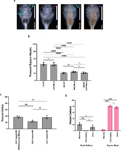 Fig. 3: Genetically diverse populations can also benefit from CEMA but unperturbed cohort members do not aid in stabilization. a Examples of wildtype and albino animals that were untreated (controls) or treated with thioridazine (treated). Blue arrows highlight normal head shape and pigmentation. Purple arrows indicate square heads and hyperpigmentation. b Percent total of embryos with square heads in two strains of Xenopus laevis, wildtype (either n = 150 or n = 300, respectively labeled on the graph) and albino (n = 150 or n = 300, respectively labeled on the graph). ****p < 0.0001. c Averages of the frequency of square head defects in a mixed group of n = 150 thioridazine-treated wildtype embryos + 150 untreated albinos, n = 300 treated wild-type embryos, and n = 150 treated wild-type embryos. **p = 0.0094 and *p = 0.0133. d Average of the frequency of brain defects and square heads in nicotine, thioridazine, and mixed treatments (n = 150 in each group). **p = 0.0019 and *p = 0.0291 for brain defects and ****p < 0.0001 for square head. All animal images are dorsal views with the anterior end at the top of the image. For all data: values are plotted as mean ± SD, one-way ANOVA, and Tukey test were conducted. All treatments are normalized to the mean of non-treated controls’ spontaneous defects. Scale bars represent 2 mm. Source data are provided as a Source Data file. |