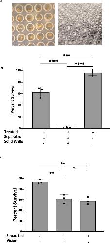 Fig. 6: CEMA requires diffusion but not physical contact. a Images of embryos undergoing thioridazine treatment in a standard physical isolation device (left) and an image of a diffusion-enhanced physical isolation device (right). b Groups of n = 300 embryos were treated with thioridazine and were isolated using windowed wells, solid wells, or unseparated. ****p < 0.0001 and ***p = 0.0010. c Groups of n = 300 embryos were either put into clear or opaque separation devices or left unseparated and treated with thioridazine. **p = 0.0021 between -separated,+vision and +separated,+vision and **p = 0.0012 between -separated,+vision and +separated,-vision. b, c were both analyzed using one-way ANOVA and Tukey tests. Values are means ± SD. All treatments are normalized to the mean of non-treated controls’ spontaneous defects. Source data are provided as a Source Data file |