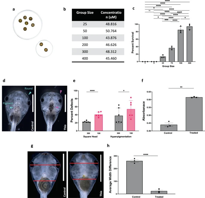 Fig. 2: Conspecific effect beyond thioridazine exposure. a Images of control (left) and forskolin-treated animals (right), demonstrating hyperpigmentation following forskolin exposure (purple arrows). b The graph shows the total frequency of hyperpigmentation in embryos exposed to forskolin in small (n = 25), medium (n = 50), and large (n = 300) groups. ****p < 0.001.. c Control animal raised in 0.1x MMR with normal brain structures (left). ****p <0.0001. Representative animals from cohorts subjected to nicotine treatment were then raised at a group size of 75 animals (right). Purple arrows highlight misshapen eyes, malformed forebrain, and midbrain. d Percent total of embryos with brain defects in groups treated with nicotine at densities of n = 10, 25, 50, 75, and 125. ****p < 0.0001, ***p = 0.0008, *p = 0.0197. e Effect of group size on incidence of defects in dominant-negative Kir6.1-injected embryos. Images of control (left) and injected (right) embryos at stage 45. Blue arrows indicate normal eyes and head shape while purple arrows point out misshapen heads and eyes. f Quantification of malformed and normal individuals at stage 45. Group size of n = 10, 25, 50, and 100. Both cells at the 2-cell stage were injected and embryos were split into different size groups post injection. *p = 0.0111, ****p < 0.0001, ***p = 0.0004, and **p = 0.0028. All animal images are dorsal views and oriented so anterior is facing up and dorsal is down. For all data: values are plotted as mean ± SD, one-way ANOVA, and Tukey tests were conducted. Each dot on the graph is a separate replicate. All treatments are normalized to the mean of non-treated controls’ spontaneous defects. Scale bars represent 2 mm. Source data are provided as a Source Data file. |