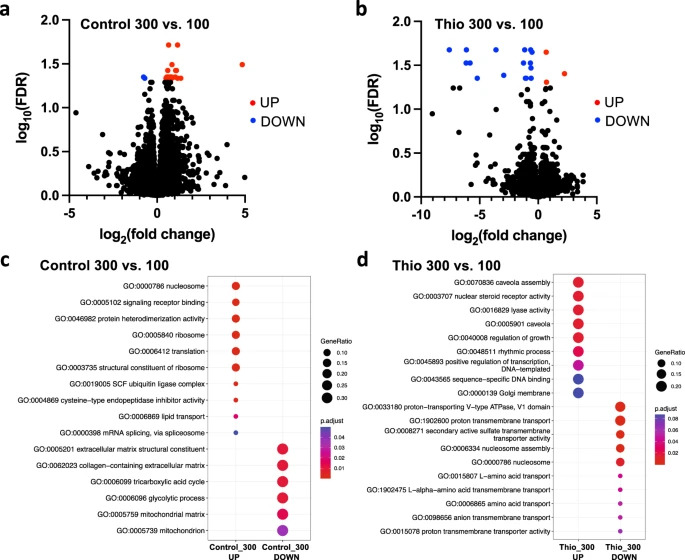 Fig. 5: Increasing cohort size induced changes to the transcription of different small sets of genes in control and thioridazine-treated embryos. Volcano plots of differential expression data for large (300 embryos) compared to small (100 embryos) groups of a control and b thioridazine-treated embryos. Genes undergoing significant changes in expression (FDR < 0.05) are highlighted in red (increased expression) and blue (decreased expression). Pathway analysis for comparison of large vs. small numbers of conspecifics in the c control and d thioridazine treatment conditions. Pathway analysis was performed by over-representation testing of the differentially expressed genes (FDR < 0.1) in the gene ontology (GO) terms/pathways and over-represented pathways were identified at a significance threshold of FDR < 0.1. The size of the dots reflects the gene ratios (number of significant genes associated with the GO term/total number of significant genes associated with any GO term), and the adjusted p-value (FDR) reflects the significance. Source data are provided as a Source Data file. |