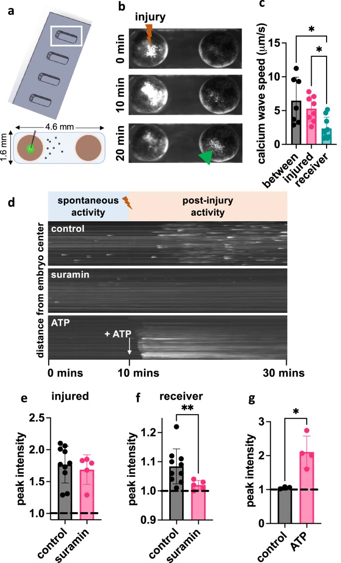 Fig. 8: Mechanical damage in Xenopus induces calcium waves in distant, uninjured conspecifics. a Dimensions for holder and embryo arrangement for injury experiments. b Fluorescent images of GCAMP6S-expressing embryos at 0-, 10-, and 20-min post-injury for untreated stage 10–12 embryos. The injured embryo is on the left and the neighboring uninjured embryo is on the right. c The speeds of GCAMP6S signal propagation between and within embryos. Speeds were compared using the Kruskal–Wallis test, assessing differences in speed between embryos (n = 7) and within injured (n = 8) and receiver (n = 9) embryos; *p < 0.05. d Kymographs of receiver embryo calcium dynamics before injury (spontaneous activity) and post-injury under control, suramin, and ATP conditions. Maximum GCAMP6S signal for e injured and f receiver embryos from the control (n = 10) and suramin-treated (n = 5) groups. Intensities are normalized to the mean of the pre-injury spontaneous activity. Groups were compared separately for injured and receiver embryos using the two-tailed Welch’s t-test; **p = 0.009. g Maximum GCAMP6S signal for embryos exposed to a bolus of MMR media (control; n = 3) or ATP (n = 4). Groups were compared using the two-tailed Welch’s t-test; *p = 0.01. All error bars represent the standard deviation. Source data are provided as a Source Data file. |