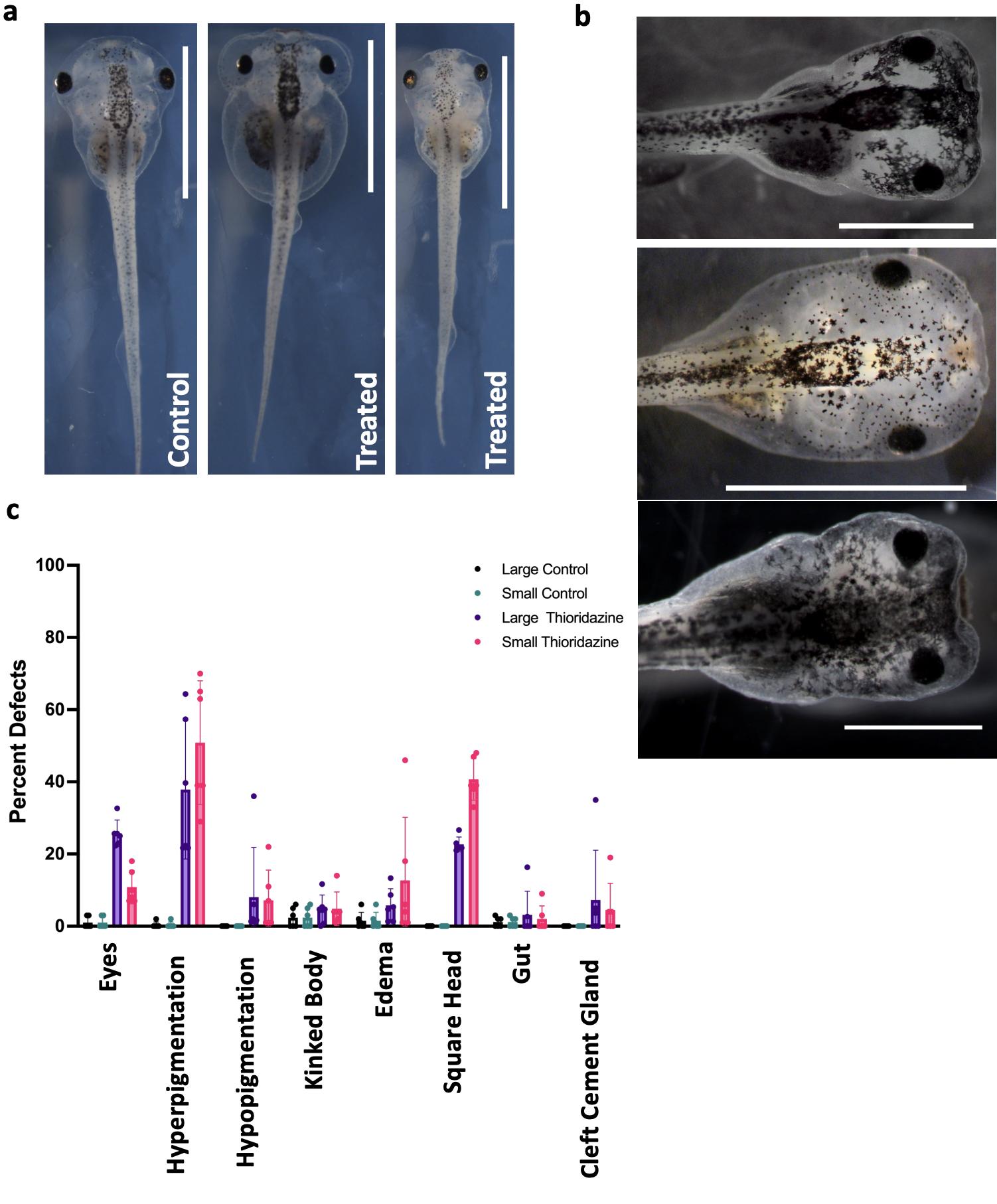Supplemental Figure 1. Additional images of thioridazine treated tadpoles and additional noted defects. (A) Whole body images of thioridazine treated animals. (B) Variations in square head phenotypes. (C) Quantification of all observed defects from thioridazine treatment in large and small groups with their respective controls. |