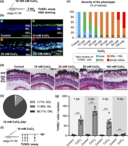 Bipolar and photoreceptor cell death following a 25 mM CoCl2 intraocular injection in X. laevis. (a) Outline of the experimental procedure used in (b–l). Stage 51–54 X. laevis tadpoles were intraocularly injected with a saline solution (control) or with 25 mM CoCl2. They were then processed for either TUNEL assay or immunostaining at different time points, as indicated. (b-e) Analysis of cell death by TUNEL staining. Shown in (b) is a representative section of a CoCl2-injected retina. The pie chart in (c) illustrates TUNEL-positive cell distribution within the different retinal layers at 2 dpi. The graph in (d) shows the quantification of the TUNEL staining area. Shown in (e) are representative retinal sections co-labeled for TUNEL and Otx2. Arrows point to double-positive cells within the ONL (yellow) and INL (white). (f–h) Immunostaining analysis of Otx2 and Pax6 expression, at 4 and 7 dpi respectively. Representative retinal sections are shown in (f) and corresponding quantifications in (g, h). (i) Representative images of retinal sections co-labeled for TUNEL and RPE65 (an RPE marker) at 2 dpi. (j) Immunostaining analysis of Opsin expression on retinal sections at 3, 7, and 14 dpi. Arrows point to mislocalized Opsin. (k) qPCR analysis of opn1sw (opsin1, short-wave-sensitive) expression in retinal extracts. Data are represented as geometric mean with 95% CI (n = 3 technical replicates). (l) Immunostaining analysis of Rhodopsin expression on retinal sections at 3, 7, and 14 dpi. The asterisk indicates the absence of rods. In all images, nuclei are counterstained with Hoechst. Except in (k), data are represented as mean ± SEM, and each point represents one retina. ns, not significant, **p < .01, ***p < .001 (Mann–Whitney tests). GCL, ganglion cell layer; INL, inner nuclear layer; ONL, outer nuclear layer; RPE, retinal pigmented epithelium. |