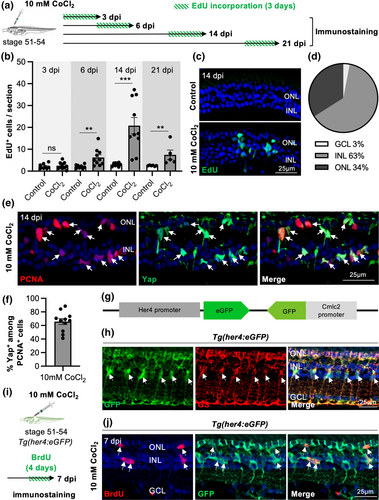 Müller glial cell proliferation following a 10 mM CoCl2 intraocular injection in X. laevis. (a) Outline of the experimental procedure used in (b–d). Stage 51–54 X. laevis tadpoles were intraocularly injected with a saline solution (control) or with 10 mM CoCl2. They were then exposed for 3 days to EdU before being processed for analysis at 3, 6, 14, or 21 dpi. (b) Quantification of EdU-positive cells per section. (c) Representative images of EdU-labeled retinal sections at 14 dpi. (d) Pie chart of EdU-positive cell distribution within the different retinal layers at 14 dpi in 10 mM CoCl2-injected tadpoles. (e) Representative images of retinal sections co-labeled for PCNA (proliferative cell marker) and Yap (Müller cell marker) at 14 dpi. (f) Quantification of Yap-positive cells among PCNA-labeled ones. (g) Schematic representation of the transgene Tg(her4:eGFP). The Her4 promoter drives eGFP expression in Müller glia, while the Cmlc2 (cardiac myosin light chain 2) promoter drives it in the heart, allowing for transgenic tadpole screening. (h) Representative images of a control Tg(her4:eGFP) retinal section, co-labeled for GFP and Glutamine Synthetase (GS; a marker of Müller cells). (i) Outline of the experimental procedure used in (J). Stage 51–54 transgenic Tg(her4:eGFP) tadpoles were intraocularly injected with 10 mM CoCl2, incubated for 4 days in BrdU, and processed for immunostaining against GFP and BrdU at 7 dpi. (j) Representative images. In (c, e, h, j), nuclei are counterstained with Hoechst. In (e, h, j), arrows point to double labeled cells. In graphs, data are represented as mean ± SEM, and each point represents one retina. **p < .01; ***p < .001; ns, not significant (Mann–Whitney tests). GCL, ganglion cell layer; INL, inner nuclear layer; ONL, outer nuclear layer. |