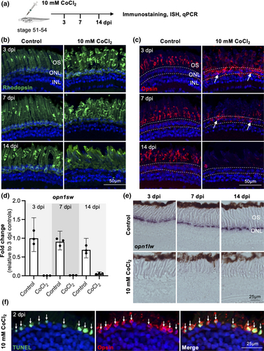 Specific cone cell death following a 10 mM CoCl2 intraocular injection in X. laevis. (a) Outline of the experimental procedure used in (b, c). Stage 51–54 X. laevis tadpoles were intraocularly injected with a saline solution (control) or with 10 mM CoCl2. They were then processed for immunostaining, in situ hybridization (ISH), or qPCR, at 3, 7, or 14 dpi. (b, c) Representative images of retinal sections labeled for Rhodopsin (b) or Opsin (c). Arrows point to mislocalized Opsin in the ONL (delineated by dashed lines). (d) qPCR analysis of opn1sw expression in control or 10 mM CoCl2-injected retinal extracts, at 3, 7, or 14 dpi. Data are represented as geometric mean with 95% CI (n = 3 technical replicates). (e) In situ hybridization analysis of opn1lw expression on retinal sections from control and 10 mM CoCl2-injected tadpoles, at 3, 7, and 14 dpi. (f) Representative images of a retinal section from a 10 mM CoCl2-injected tadpole, co-labeled for TUNEL and Opsin at 2 dpi. Arrows point to double-positive cells. Cell nuclei are counterstained with Hoechst. INL, inner nuclear layer; ONL, outer nuclear layer; OS, photoreceptor outer segments. |