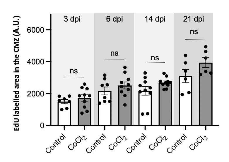 Figure S2. Absence of CMZ proliferative response following a 10 mM CoCl2 intraocular injection in