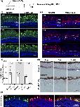 Neurogenic potential of Müller glia and CMZ cells following a 25 mM CoCl2 intraocular injection in X. laevis. (a) Outline of the pulse-chase experiment performed in (b-h). Stage 51–54 X. laevis tadpoles were intraocularly injected with a saline solution (control) or with 25 mM CoCl2. They were then exposed to EdU or BrdU from 3 to 7 dpi and finally processed for EdU or BrdU staining and immunolabeling at different time points, as indicated. (b) Representative images of retinal sections from CoCl2-injected tadpoles, co-labeled for BrdU and either Pax6 (identifying ganglion cells in the GCL and amacrine cells in the INL), Otx2 (identifying bipolar cells in the INL and photoreceptors in the ONL), Rhodopsin (rods), Opsin (cones), or Yap (Müller cells). White and yellow arrows point to double-positive cells in the INL and ONL, respectively. (c) Proportions of the different retinal cell types among BrdU-labeled ones. (d) Opsin immunolabeling on retinal sections at 2 mpi. Arrows highlight the complete absence of staining in CoCl2-injected retinas. (e) Representative images of retinal sections at the level of the CMZ. White arrows point to newborn cones produced by the CMZ. Yellow arrowheads indicate the absence of cones more centrally. (f) Representative images of retinal sections stained for EdU and Opsin at 1 mpi, after an EdU-pulse from 4 to 7 dpi. Arrows point to CMZ-derived newborn neurons (EdU-positive) in the different retinal layers. (g) Quantification of CMZ-derived EdU-positive cells. (h) Distribution of CMZ-derived EdU-positive cells within the three retinal layers. In all images, nuclei are counterstained with Hoechst. In (c, g), data are represented as mean ± SEM, and each point represents one retina. **p < .01; ns, not significant (Mann–Whitney tests (c, g) or two-way ANOVA (h)). CMZ, ciliary marginal zone; GCL, ganglion cell layer; INL, inner nuclear layer; ONL, outer nuclear layer. |