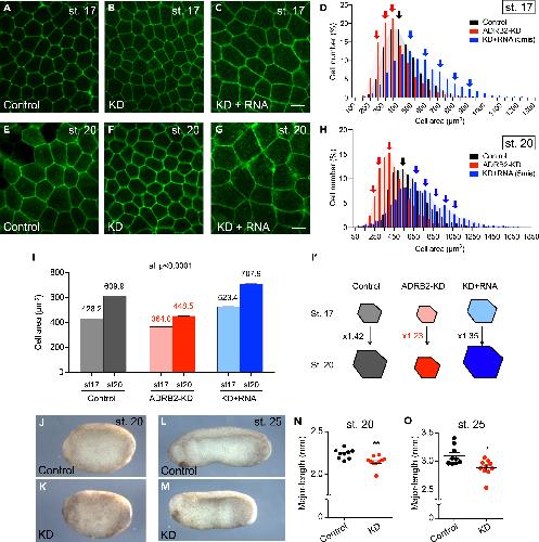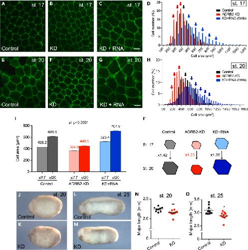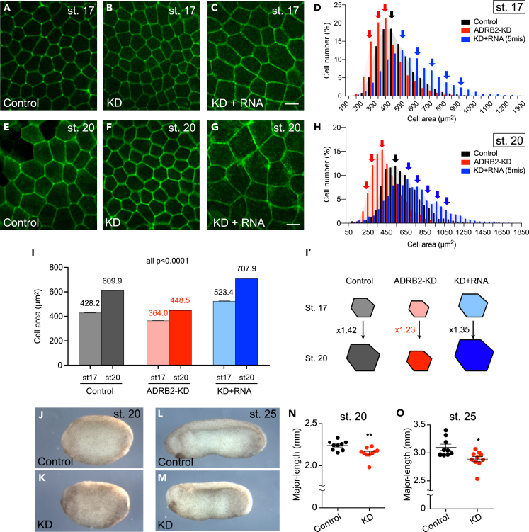 Figure 4. ADRB2 controls apical cell area (A–C) Live-imaging of epidermis of membrane-gfp-injected control embryo (A), adrb2-KD (B), and embryos rescued by co-injection of adrb2-RNA (C) at stage 17. (D) Measurement of the apical area of epidermal cells and their distribution in each group at Stage 17. (black, control; red, adrb2-KD; blue, rescued) (∗∗∗∗p < 0.0001, Kolmogorov-Smirnov test. control: n = 3686 cells from 7 embryos; adrb2-KD: n = 5131 cells from 9 embryos; KD + RNA: n = 3464 cells from 10 embryos). (E–G) Live-imaging of epidermis of membrane-gfp-injected control embryo (E), adrb2-KD (F), and embryos rescued by co-injection of adrb2-RNA (G) at stage 20. (H) Measurement of the apical area of epidermal cells and their distribution in each group, at Stage 20. (control: n = 2423 cells from 7 embryos, adrb2-KD: n = 4212 cells from 10 embryos, KD + RNA: n = 2594 cells from 10 embryos). (I) Comparison of the average apical cell area in each group at both stages. Numbers show the average of apical cell area. (I′) Schemes showing the fold ratio of expanded apical cell area using average from Stage 17 to Stage 20 in each group. (J–M) Images of control and KD embryos at Stage 20 (J and K) and 25 (L and M). (N and O) Body length measurement (N, control: n = 9, KD: n = 10, ∗∗p = 0.0021; O, control: n = 9, KD: n = 10, ∗p = 0.01). Data in (I), (N), and (O) are represented as mean ± SEM. (GFP, green fluorescence protein; KD, knockdown). |