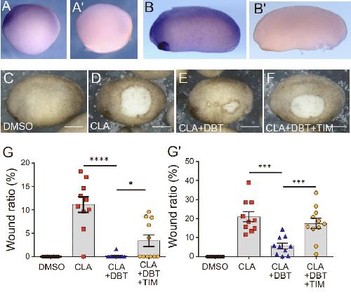 Figure S3. adrb2 RNA is expressed in the epidermis during the stages tested for the chemical screening. Related to Figure 2. (A, A') In situ hybridization of adrb2 (A) and negative control (A') at Stage 14, lateral view. (B, B') In situ hybridization of adrb2 (B) and negative control (B') at Stage 21, lateral view. (C–F) Embryos treated with DMSO, 100 µM (C); CLA, 200 nM (D); CLA (200 nM) and DBT (800 µM) (E); and CLA (200 nM), DBT (800 µM), and TIM (50 µM) (F). The white area represents the wound site. (G, G') Quantification of the wound ratio at 30 (G) and 60 (G') min after treatment (n=9–11, ****p<0.0001, ***p<0.001, *p<0.05, as assessed using one-way analysis of variance; Scale bar: 500 µm). Data are represented as mean +/- SEM. (DBT, dobutamine; DMSO, dimethyl sulfoxide; CLA, calyculin A) |