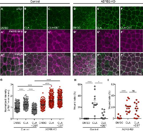 Figure 3. DBT suppresses phosphorylation of MYL by acting on ADRB2 (A–F″) Immunostaining of the epidermis using antibodies against pMyl (green), E-cad (magenta), and GFP (membrane, blue). Embryos were injected with membrane-gfp and control-MO (A–C) or adrb2-MO (40 ng/blastomere at the 4-cell stage) (D–F). (G) Quantification of pMyl intensity at cell-cell junctions, normalized to membrane-GFP intensity (n = 316–713 cell junctions from 3 to 4 embryos, ∗∗∗∗p < 0.0001, as assessed using one-way analysis of variance; Scale bar: 20 μm). DMSO, 250 μM; CLA, 250 nM; DBT, 1 mM. Embryos were fixed following a 10 min CLA treatment. All images are representative of 3–4 embryos in each group. (H and I) Normalized wound ratio measurement 2 h after treatment of CLA in control (H) and adrb2 knockdown embryos (I). (n = 12 embryos, ∗p = 0.0187, ∗∗∗∗p < 0.0001, one-way analysis of variance). Data in (G), (H), and (I) are represented as mean ± SEM. (MYL, myosin light chain; pMyl, phosphorylated MYL; ADRB, beta-adrenergic receptor; E-cad, E-cadherin; MO, morpholino antisense oligonucleotides; KD, knockdown; CLA, calyculin A; DBT, dobutamine). |