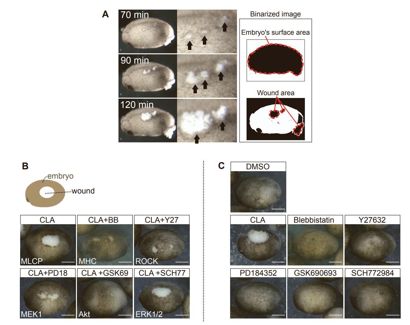Figure S1. CLA induces a wound on the epidermis by activating actomyosin contraction. Related to Figure 1. (A) Still images from a time-lapse movie taken after treatment with 250 nM CLA. Arrows indicate the damages induced by CLA on the epidermis. Binarized images were used for measuring the embryo surface and wound areas, from which we then calculated the wound ratio and the normalized wound ratio (NWR). (B) Images of the embryos measured in Fig. 1D. Co-treatment with CLA (200 nM) and an actomyosin or kinase-related inhibitor: BB (myosin II inhibitor), 100 µM; Y27 (ROCK inhibitor), 100 µM; PD18 (ERK inhibitor), 10 µM; GSK69 (Akt kinase inhibitor), 1 µM; and SCH77 (ERK1/2 inhibitor), 1 µM. (C) Treatment with myosin-related kinase inhibitors. Images of Stage 20 embryos, after 1 h of treatment with inhibitors. DMSO, 25 µM; CLA, 200 nM; BB, 100 µM; Y27632, 10 µM; GSK690693, 1 µM; SCH772984, 1 µM (n=10 each). The concentrations used were about IC50 in cell-based assays × 100 –500. Scale bar: 500 µm. Note that CLA alone causes wounds, while others do not. (CLA, calyculin A; BB, blebbistatin; ROCK Rho-associated protein kinase; MLCK, myosin light chain kinase; ERK, extracellular signal-regulated kinase; DMSO, dimethyl sulfoxide) |