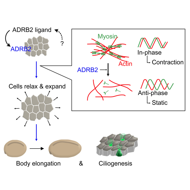 During morphogenesis, epithelial tissues reshape and expand to cover the body and organs. The molecular mechanisms of this deformability remain elusive. Here, we investigate the role of the β-adrenergic receptor (ADRB) in orchestrating actomyosin contractility, pivotal for epithelial extensibility. Chemical screens on Xenopus laevis embryos pinpointed ADRB2 as a principal regulator. ADRB2 promotes actomyosin relaxation, facilitating apical cell area expansion during body elongation. In contrast, ADRB2 knockdown results in heightened cell contraction, marked by synchronous oscillation of F-actin and myosin, impeding body elongation. ADRB2 mutants with reduced affinity for ligand binding lack the function to induce cellular relaxation, highlighting the ligand's essential roles even in the developing epidermis. Our findings unveil ADRB2's critical contribution to extensibility of the epidermis and subsequent body elongation during development. This study also offers insights into the physiology of mature epithelial organs deformed by the smooth muscle response to the adrenergic autonomic nervous system.