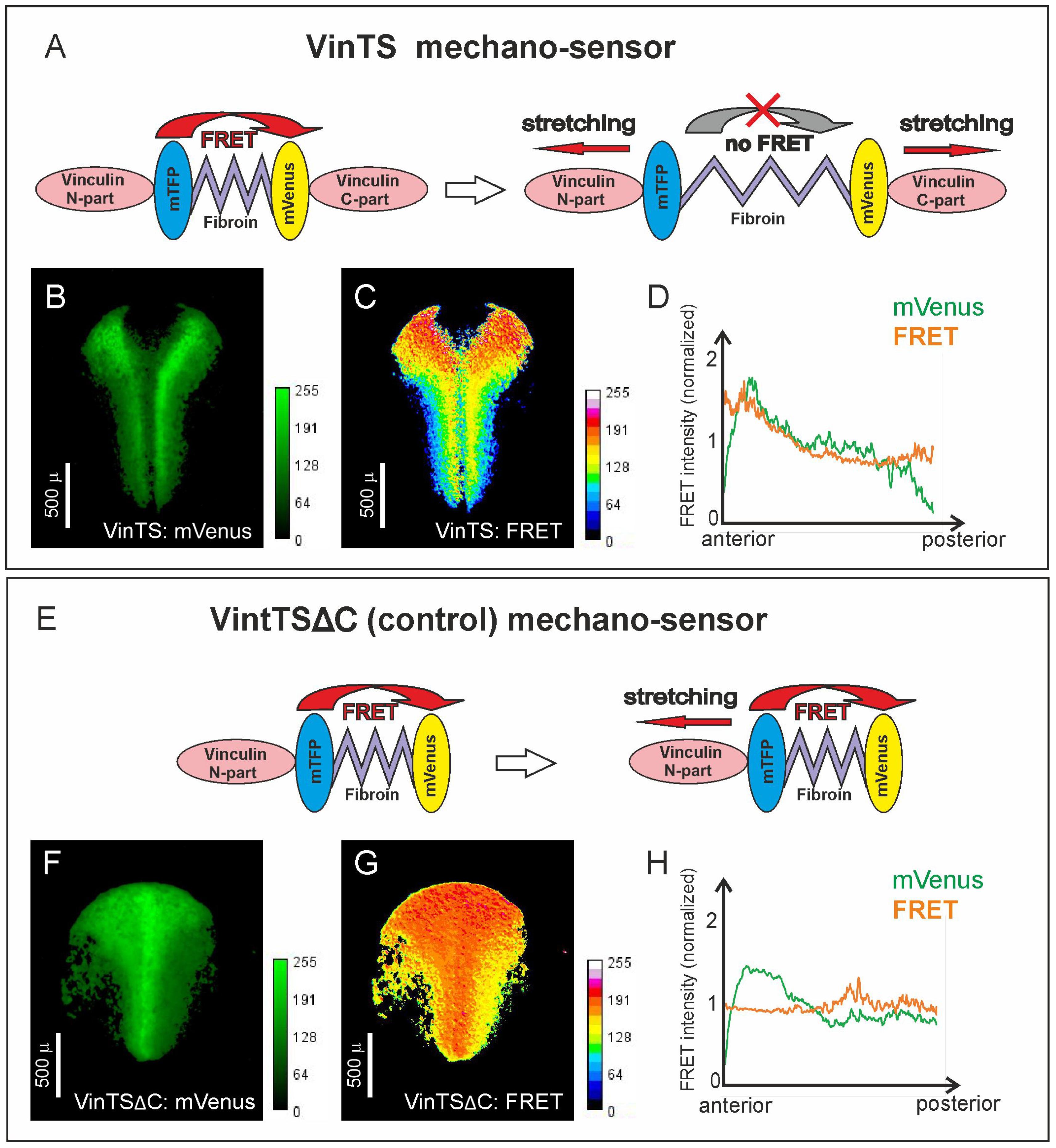 Figure 1. Genetically encoded mechanical sensor VinTS reveals different mechanical tensions in the head and trunk parts of the neuroectoderm. (A–D) VinTS mechanosensor. (E–H) VinTSΔC control. (A,E) Schema of sensor. (B,F) Images of the Xenopus embryo, microinjected with the VinTS mRNA, in the green channel. (C,G) The result of computer processing of images in green and cyan channels. Red color corresponds to low degree of MTs (high FRET); yellow and blue color corresponds to high degree of MTs (low FRET). (D,H) Vertical plot showing the distribution of signal intensity (green) and FRET (orange) along the anterior–posterior axis of the embryo. |
