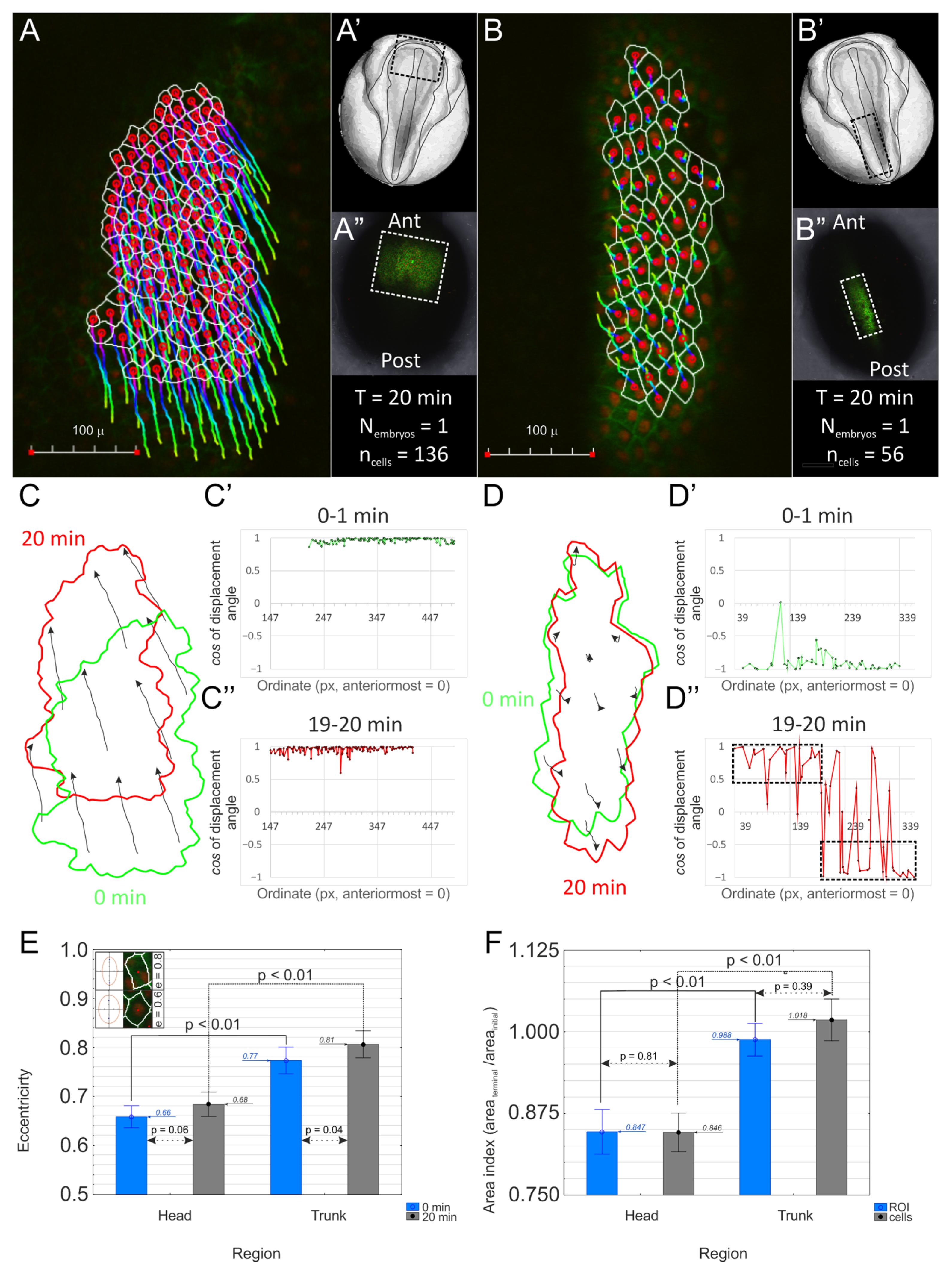 Figure 2. Morphometric analysis of tissue deformation. (A,B) To evaluate tissue deformation, we performed time-lapse imaging of cells in head (A) and trunk (B) regions of st. 14–15 Xenopus neurula during a 20 min interval. Insets in the right row show the position of segmented regions (enclosed with white dashed line) on scheme (A′,B′) and in imaged embryos (A″,B″) under lower magnification. Cell trajectories in (A,B) are color-coded: yellow–green indicates the initial part of the trajectory, blue—central, purple–red—terminal. (C,D) Tissue-level deformation evaluated by shape change of integral ROI including all segmented cells. Green and red counters reflect ROI shape at the first and last frame, respectively, of the time-lapse sequence. Individual trajectories of selected cells are visualized as black lines; arrows indicate direction of cell displacements inside ROIs. (C′,D′) and (C″,D″): To quantitatively describe spatial distribution of cell displacements underlying ROI deformation presented in (C,D), we calculated cosine of the angle between anteroposterior axis and direction of each cell displacement during two initial (C′,D′) and two terminal (C″,D″) frames in sequence and plotted this cosine value against ordinate (in pixels). We denote 0° (360°) displacement angle as shift towards anterior pole, and 180°—towards posterior. Thus, cosine values close to 1 indicate displacement towards the anterior pole, and values close to −1—towards the posterior pole. Note the marked translational shift of ROI in the head region without significant elongation on the contrary to the trunk region, that mostly remained in the field of view and was subjected to bidirectional ((D″) black dotted boxes) elongation. (E,F) To estimate cellular shape changes underlying observed ROI deformations, we analyzed distribution of cell eccentricities (E) for head (Nembryos = 1, ncells = 136) and trunk (Nembryos = 1, ncells = 56) regions at the start (blue) and the end (grey) of time-lapse series as well as area changes (F) of cells (blue) and small ROIs, including 10–11 cells (gray); columns show mean, whiskers—95% confidence interval. Inset in (E) (reprinted under Creative Commons 3.0 license) shows typical cell and respective ellipse shape for eccentricity = 0.6 and for eccentricity = 0.8. Note the slight (but statistically significant) increase in mean eccentricity in the trunk region while the apical cell area remains the same, reflecting cell elongation in the trunk region. At the same time, mean eccentricity in the head region did not change, while the apical cell area decreased, reflecting apical constriction. |