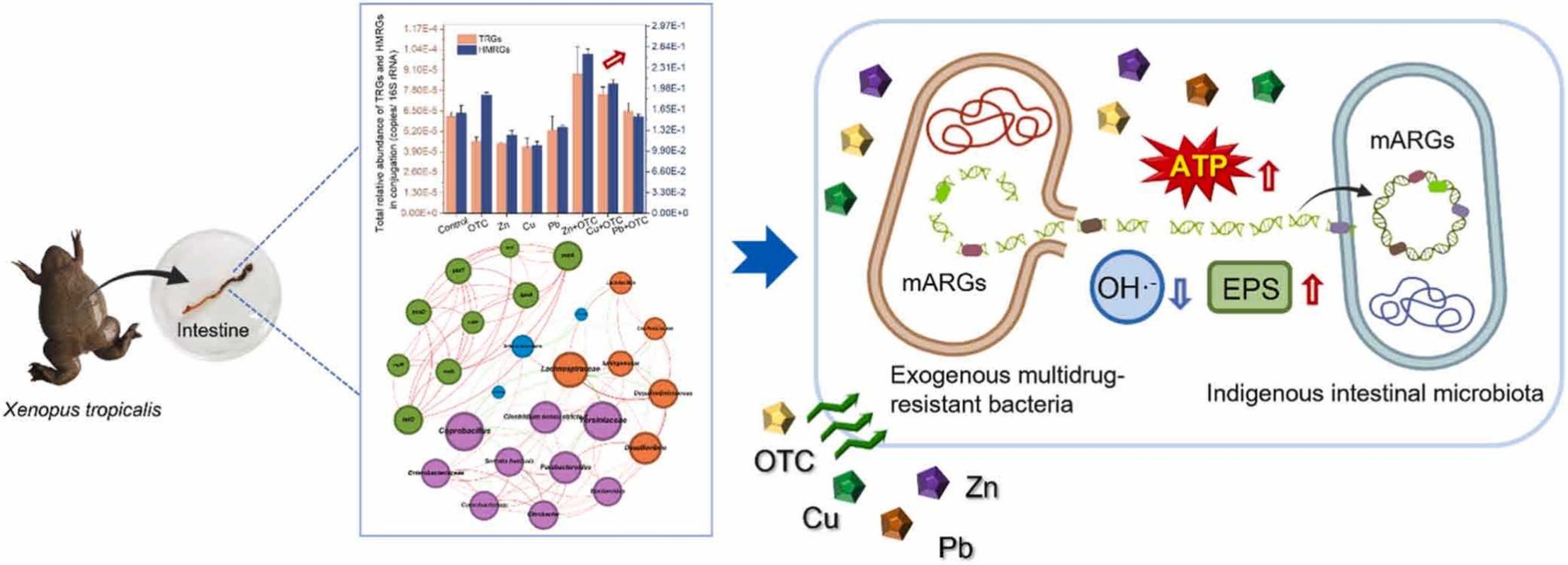 The intestinal microbiome might be both a sink and source of resistance genes (RGs). To investigate the impact of environmental stress on the disturbance of exogenous multidrug-resistant bacteria (mARB) within the indigenous microbiome and proliferation of RGs, an intestinal conjugative system was established to simulate the invasion of mARB into the intestinal microbiota in vitro. Oxytetracycline (OTC) and heavy metals (Zn, Cu, Pb), commonly encountered in aquaculture, were selected as typical stresses for investigation. Adenosine 5'-triphosphate (ATP), hydroxyl radical (OH·-) and extracellular polymeric substance (EPS) were measured to investigate their influence on the acceptance of RGs by intestinal bacteria. The results showed that the transfer and diffusion of RGs under typical combined stressors were greater than those under a single stressor. Combined effect of OTC and heavy metals (Zn, Cu) significantly increased the activity and extracellular EPS content of bacteria in the intestinal conjugative system, increasing intI3 and RG abundance. OTC induced a notable inhibitory response in Citrobacter and exerted the proportion of Citrobacter and Carnobacterium in microbiota. The introduction of stressors stimulates the proliferation and dissemination of RGs within the intestinal environment. These results enhance our comprehension of the typical stresses effect on the RGs dispersal in the intestine.