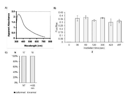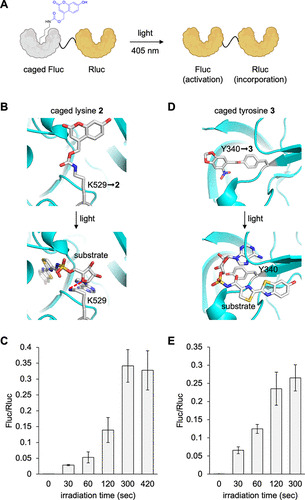 Figure 3. Conditional control of enzymatic activity with photocaged UAAs 2 and 3. (A) Luciferase enzymatic activation in Xenopus embryos with light. Structural representation of caging of the Fluc active site with either (B) 2 or (D) 3 before and after irradiation (PDB: 4G36). Incorporation of (C) 2 or (E) 3 into the dual luciferase reporter and irradiation for increasing duration with a 405 nm light at 24 hpf. Bars represent means, and error bars represent standard deviations of measurements from three independent embryos. |