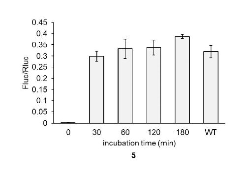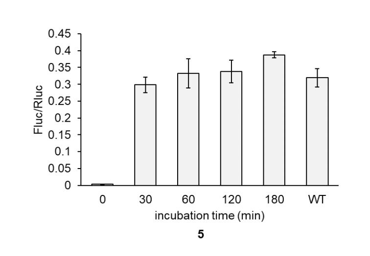 Figure S8. Activation of UAA 5 incorporated dual-luc reporter using phosphine after embryo lysis. Phosphine 16 (100 µM) was added to the lysate and incubated at 23 °C for the time indicated. Bars represent mean and error bars represent standard deviation of biological triplicate. |
