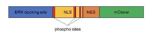 Figure S10. Schematic of the ERK-KTR reporter. In its unphosphorylated state, the nuclear localization predominates. Phosphorylation of the NLS sites by ERK inactivates the NLS sequence, allowing for nuclear exclusion to predominate. |