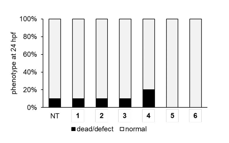 Figure S3. Toxicity assay of UAAs 1-6 in xenopus embryos measured at 24 hpf. A volume of 5 nl of a 10 mM solution of UAAs 1, 2, 4, and 5 were injected and embryos were incubated at 23 °C for 24 hours. For UAA 3, embryos were incubated at 23 °C in embryo media supplemented with 0.25 mM of 3. For UAA 6, embryos were incubated at 23 °C in embryo media supplemented with 1 mM of 6. N = 10 for each condition. |