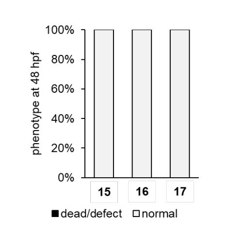 Figure S7. Toxicity assay of phosphines after treatment at 48 hpf. Concentration was 50 µM for 15 and 100 µM for 16 and 17. Embryos were treated at 24 hpf for 3 hours and then scored at 48 hpf. N = 20 for each condition. |