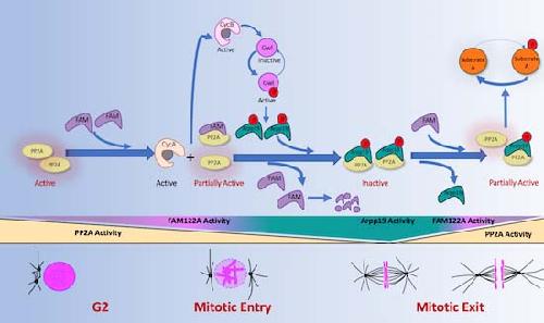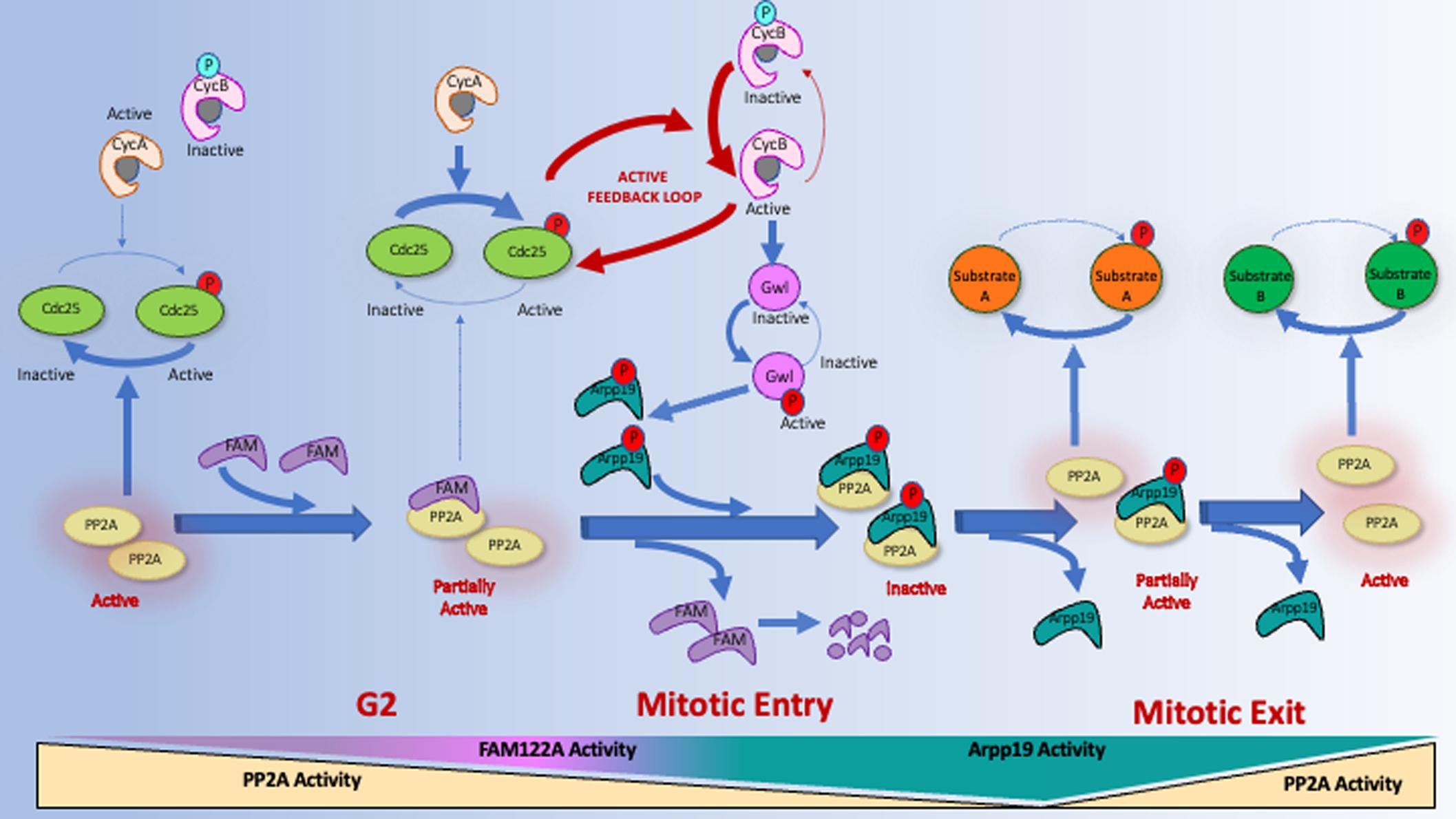 Increases in cyclin A/Cdk activity and in PP2A-B55 inhibition by FAM122A are key mitosis-inducing events.