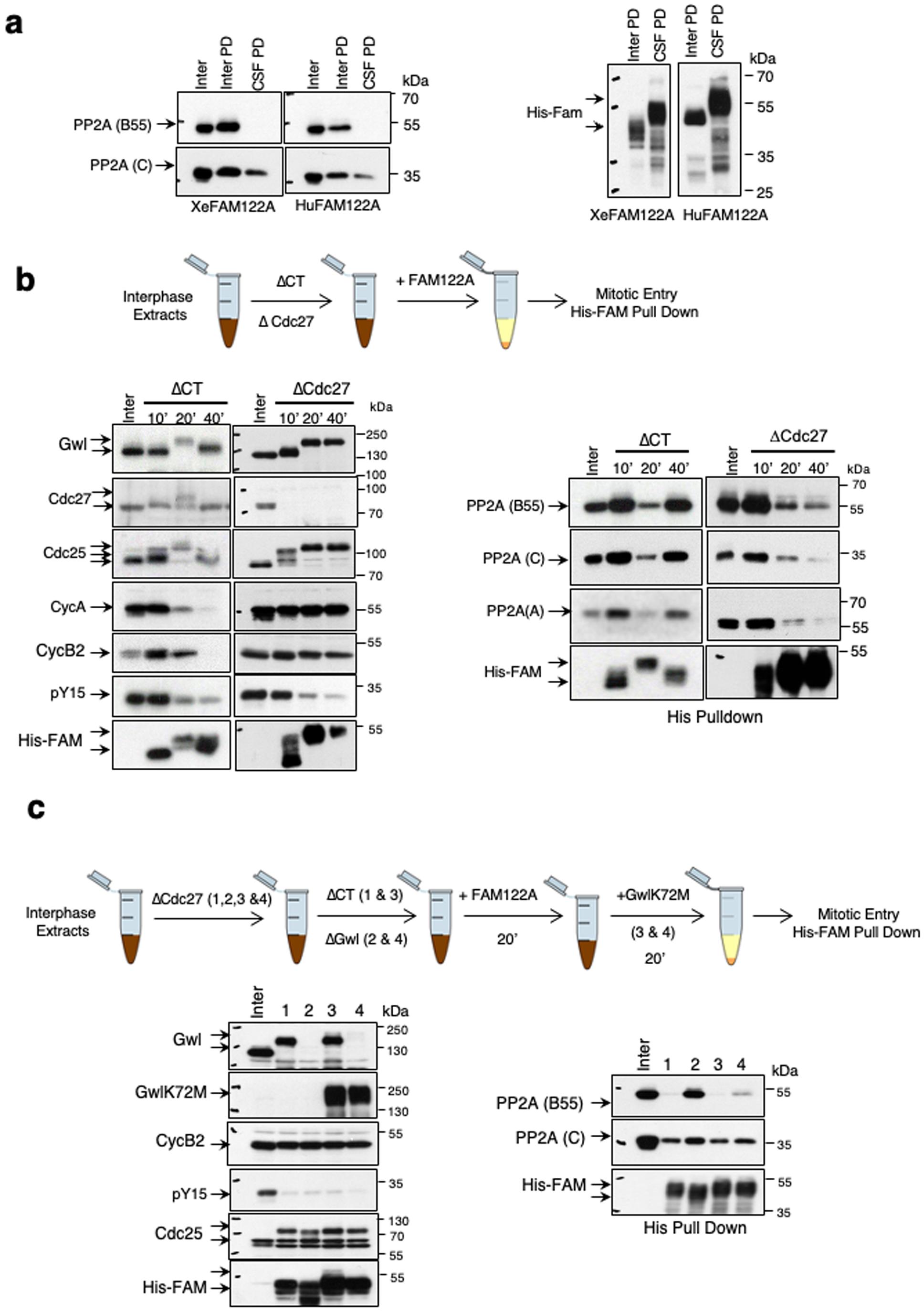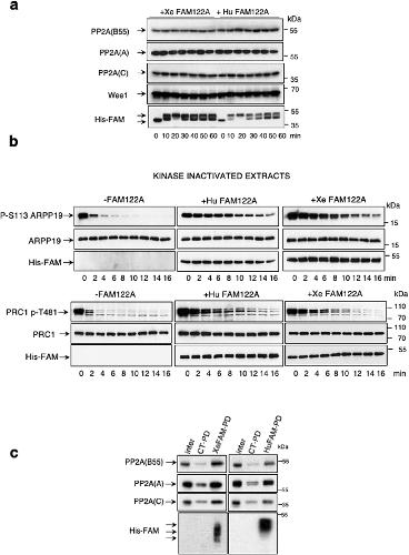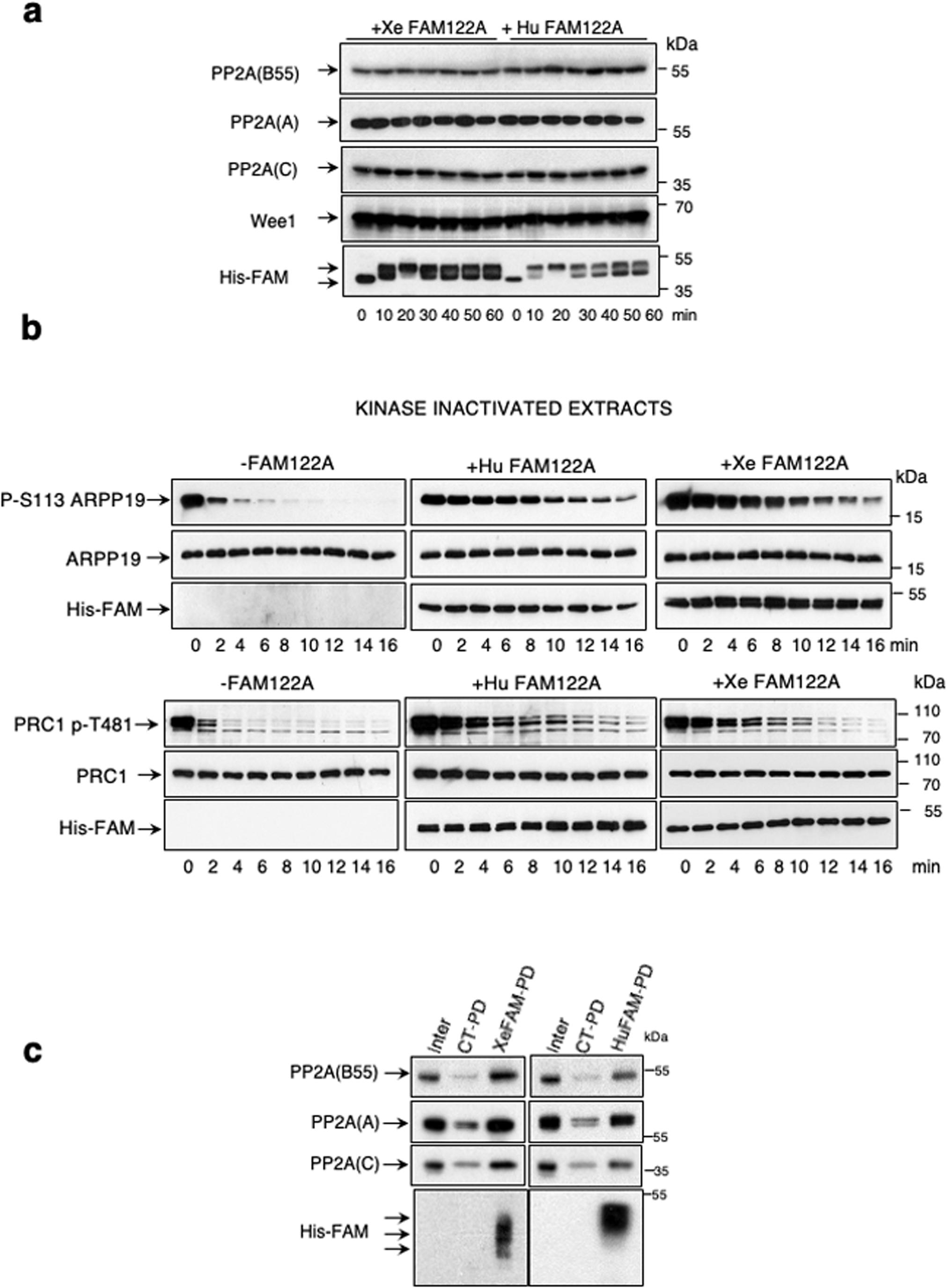 Figure 1. PP2A-B55 inhibition by FAM122A does not involve changes in PP2A-C or Wee1 levels. (A) 20 μl of interphase extracts were supplemented with a final concentration of 7.15 μM of Xenopus or of human FAM122A and 0,8 μl of the mix was recovered at different time points to measure the indicated proteins by western blot. (B) Arpp19 or PRC1 proteins “in vitro” phosphorylated by PKA or by cyclin A/Cdk1 respectively were supplemented at a final concentration of 1.65 μM together with Xenopus or human FAM122A (final concentration of 14.3 μM) to kinase inactivated interphase extracts and the dephosphorylation rate of S113 of Arpp19 and T481 of PRC1 as well as the levels of Xenopus and human FAM122A were analysed by western blot. (C) Interphase extracts were supplemented (Xe/HuFAM-PD) or not (CT-PD) with either Xenopus or human FAM122A as in (A) and used for histidine pull-down. The levels of PP2A B55, A and C subunits as well as the amount of FAM122A were checked by western blot. Source data are available online for this figure. |