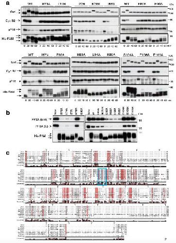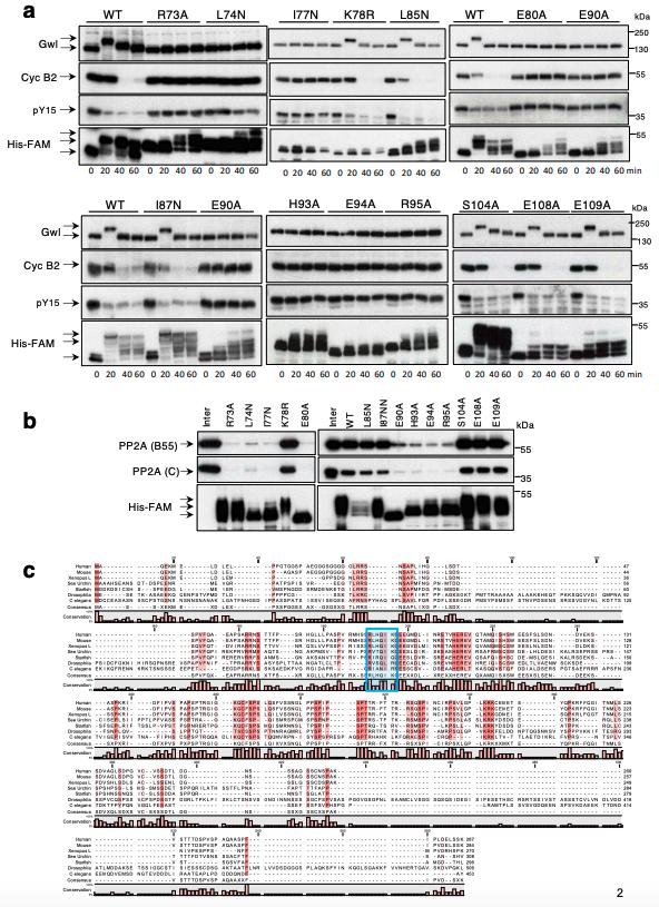 Appendix Figure S1, related to Fig.3 Identification of the residues of aH1 and aH2 required to PP2A inhibitory activity of Xe FAM122A. (a) The capacity of the indicated mutants of Xe FAM122A to promote mitotic entry when supplemented to interphase extracts is shown. (b) B55/C binding to the single mutants of the aH1 and aH2 is measured by His-pull down. (c) FAM122A sequence alignment on different species. Putative SLiM motif is highlighted in blue. |